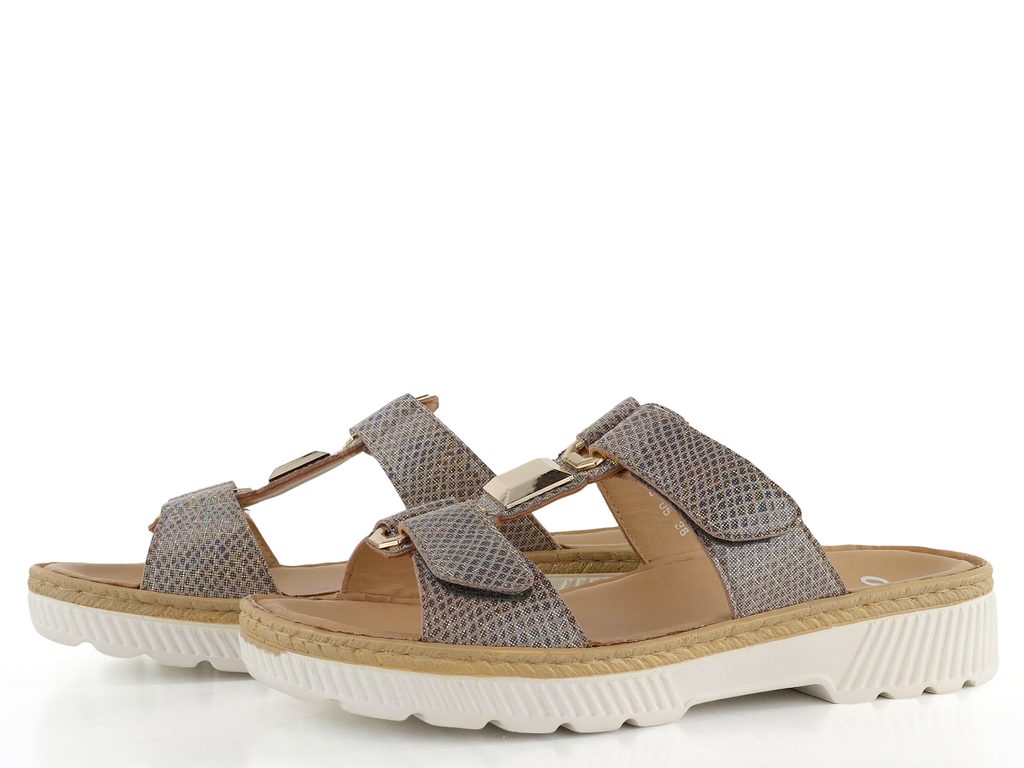 Dámské kožené pantofle s barevným leskem, upínacími pásky na suchý zip a robustní podešví.