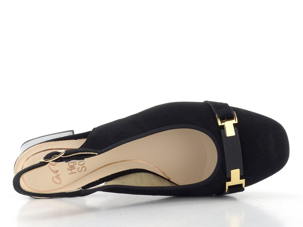Elegantní široké dámské lodičky s volnou patou v klasickém černém provedení s kovovými komponenty ve zlaté barvě.