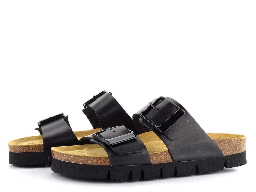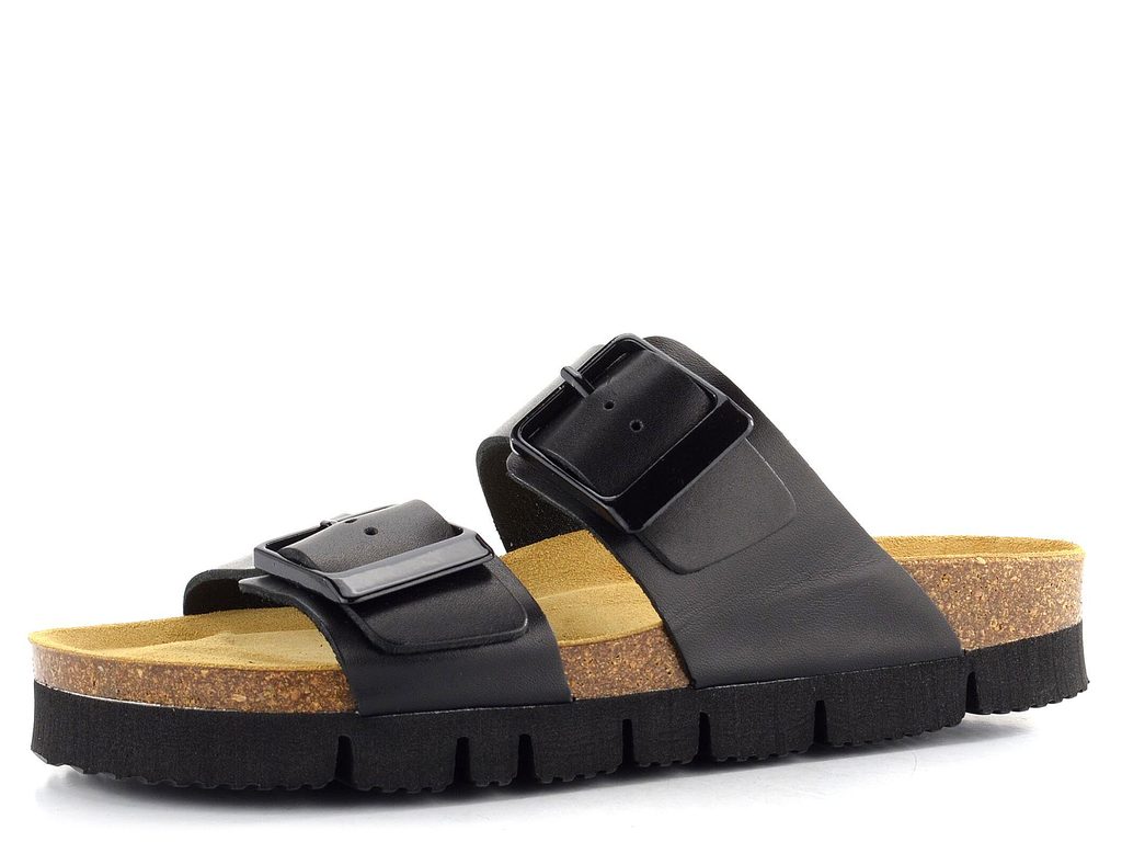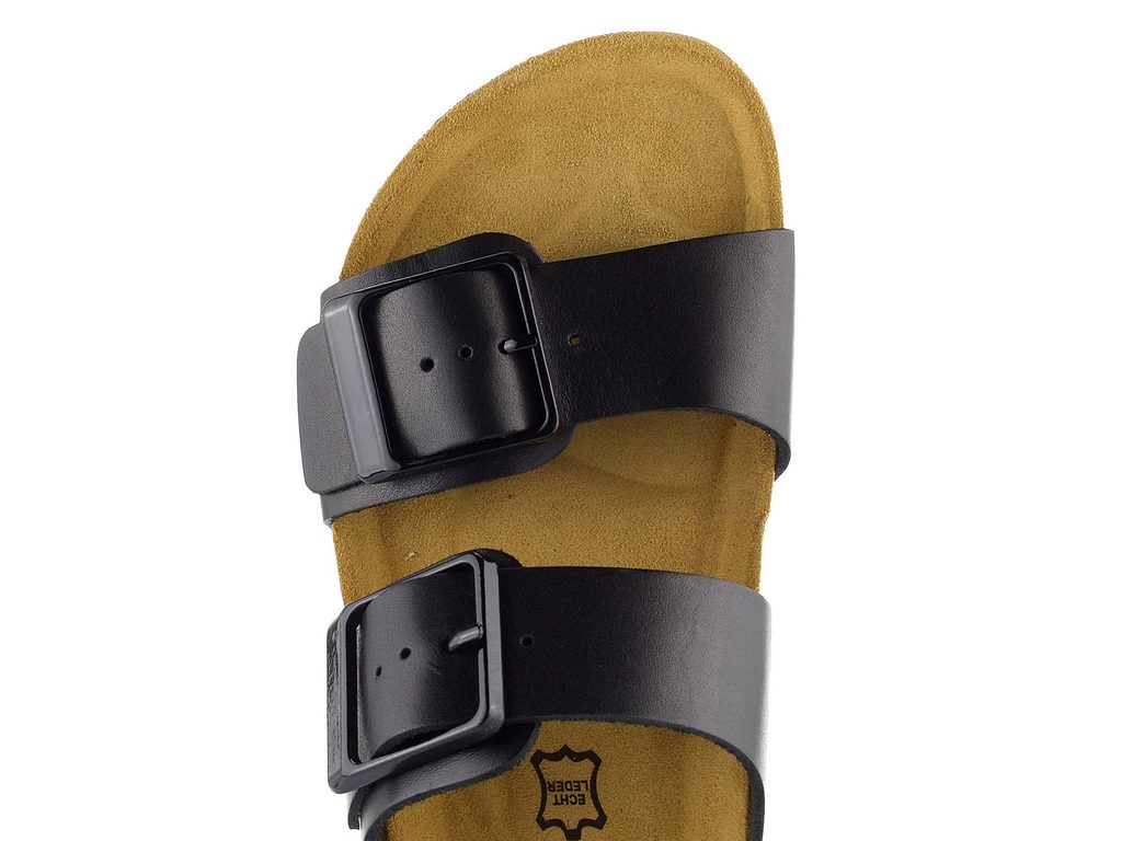 Dámské kožené fuzbetové pantofle se dvěma pásky v černé barvě a měkkou tvarovanou stélkou.