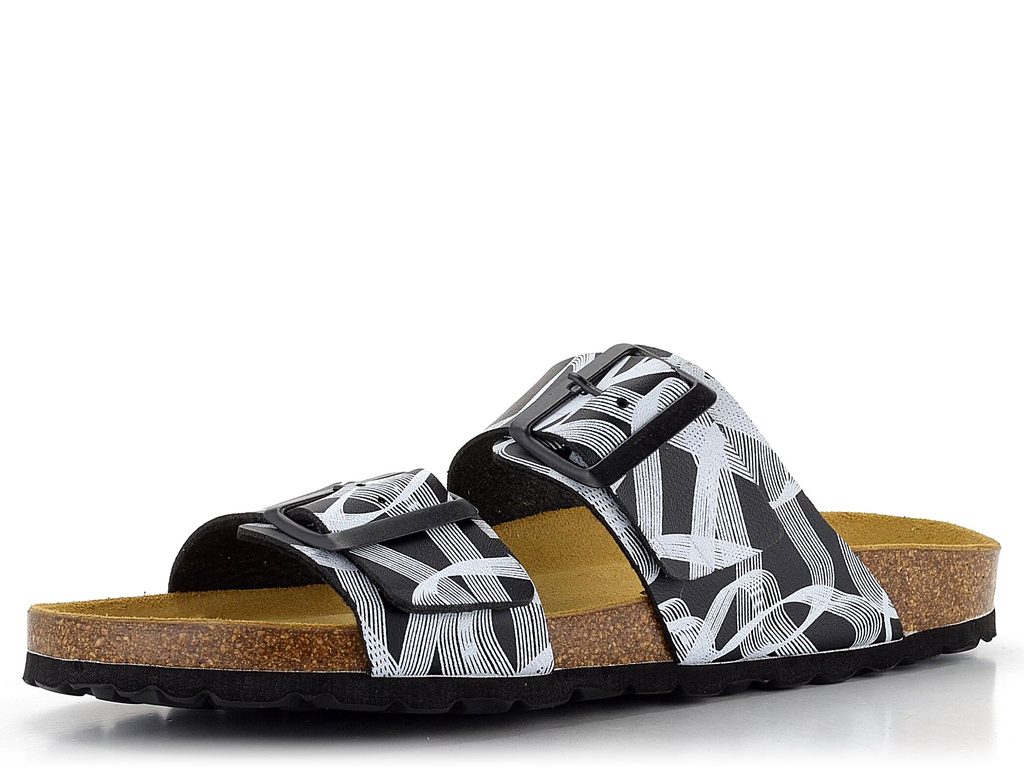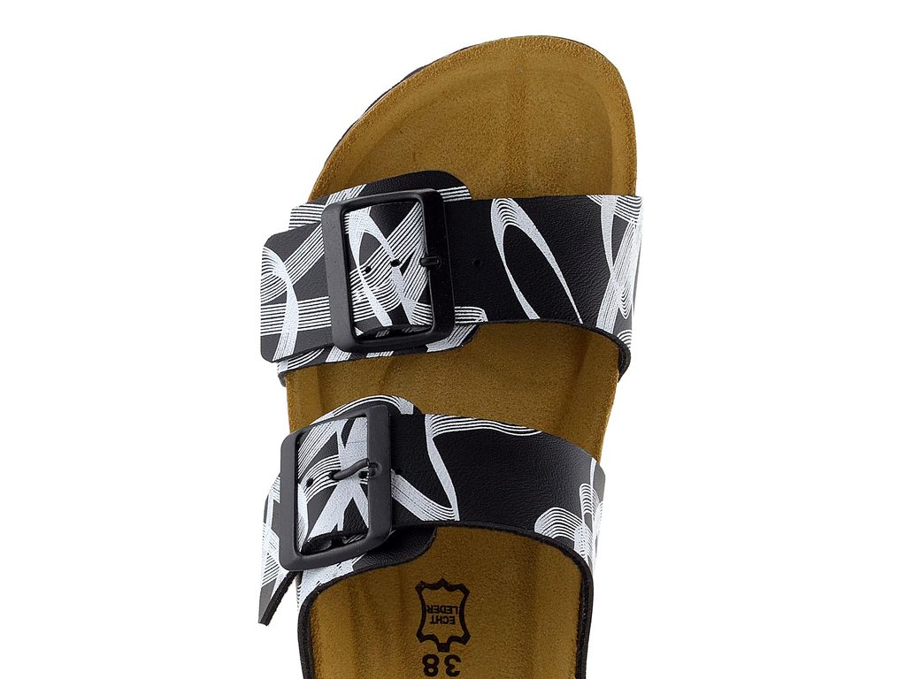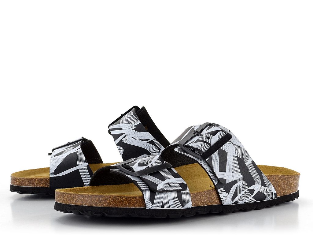 Dámské fuzbetové pantofle s černo-bílým vzorem a dvěma nastavitelnými pásky.