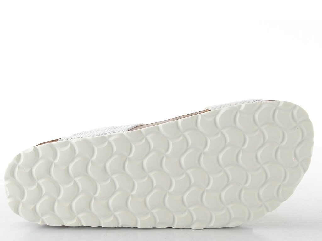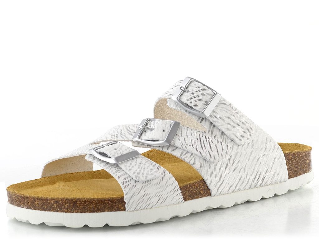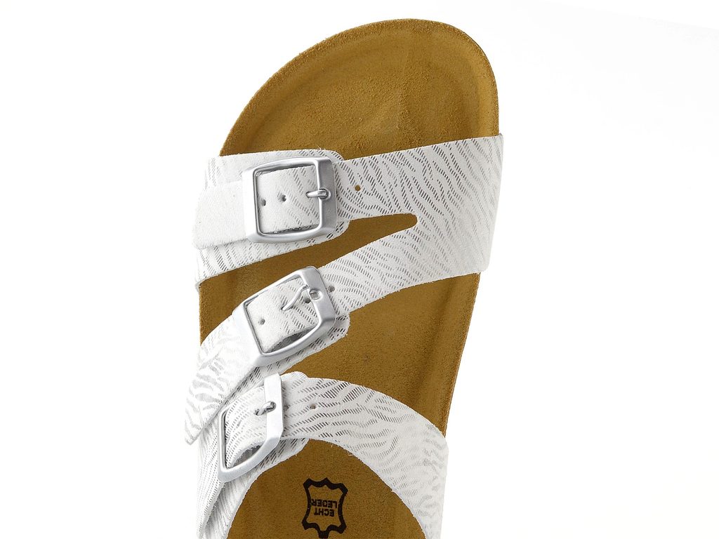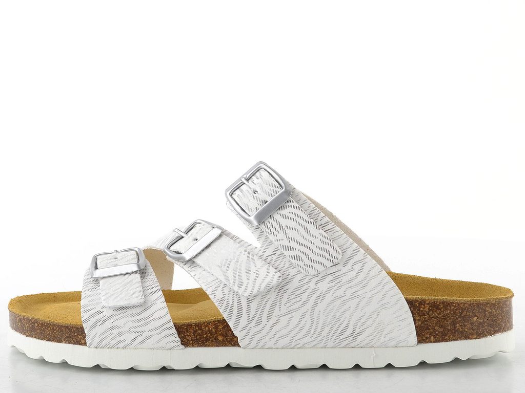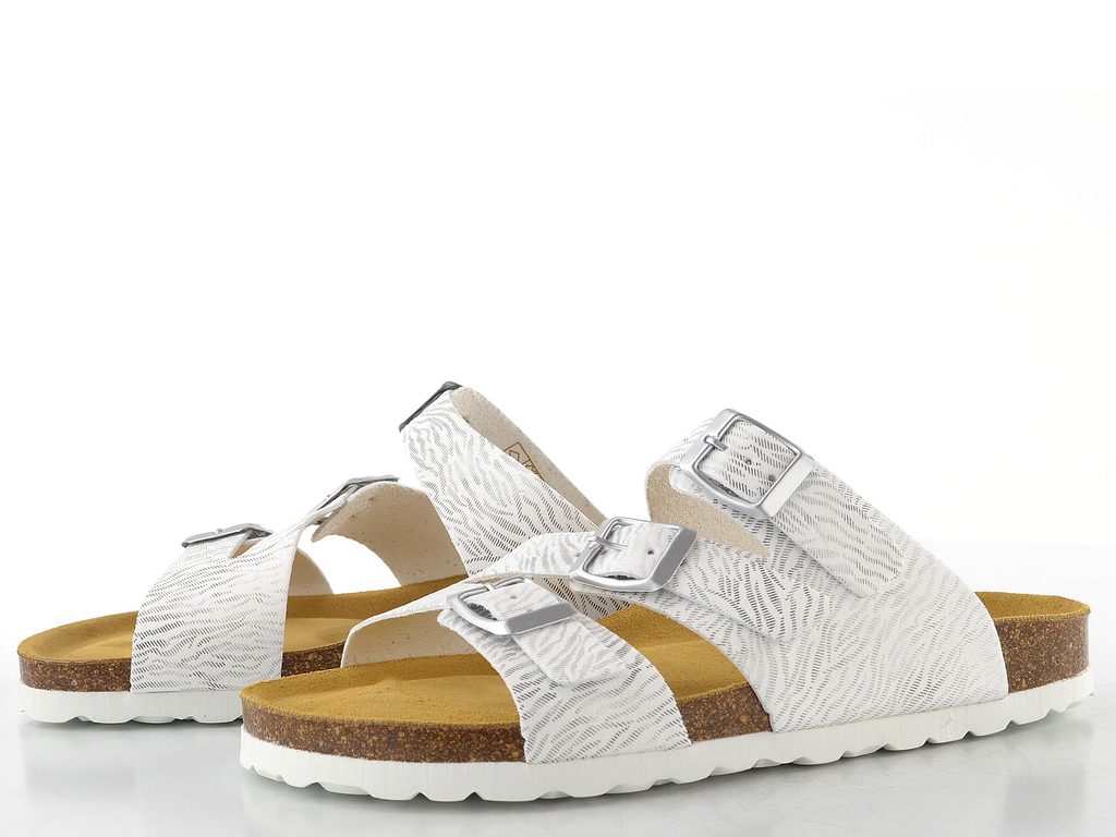 Dámské fuzbetové pantofle se třemi nastavitelnými pásky v bílo-stříbrném provedení.