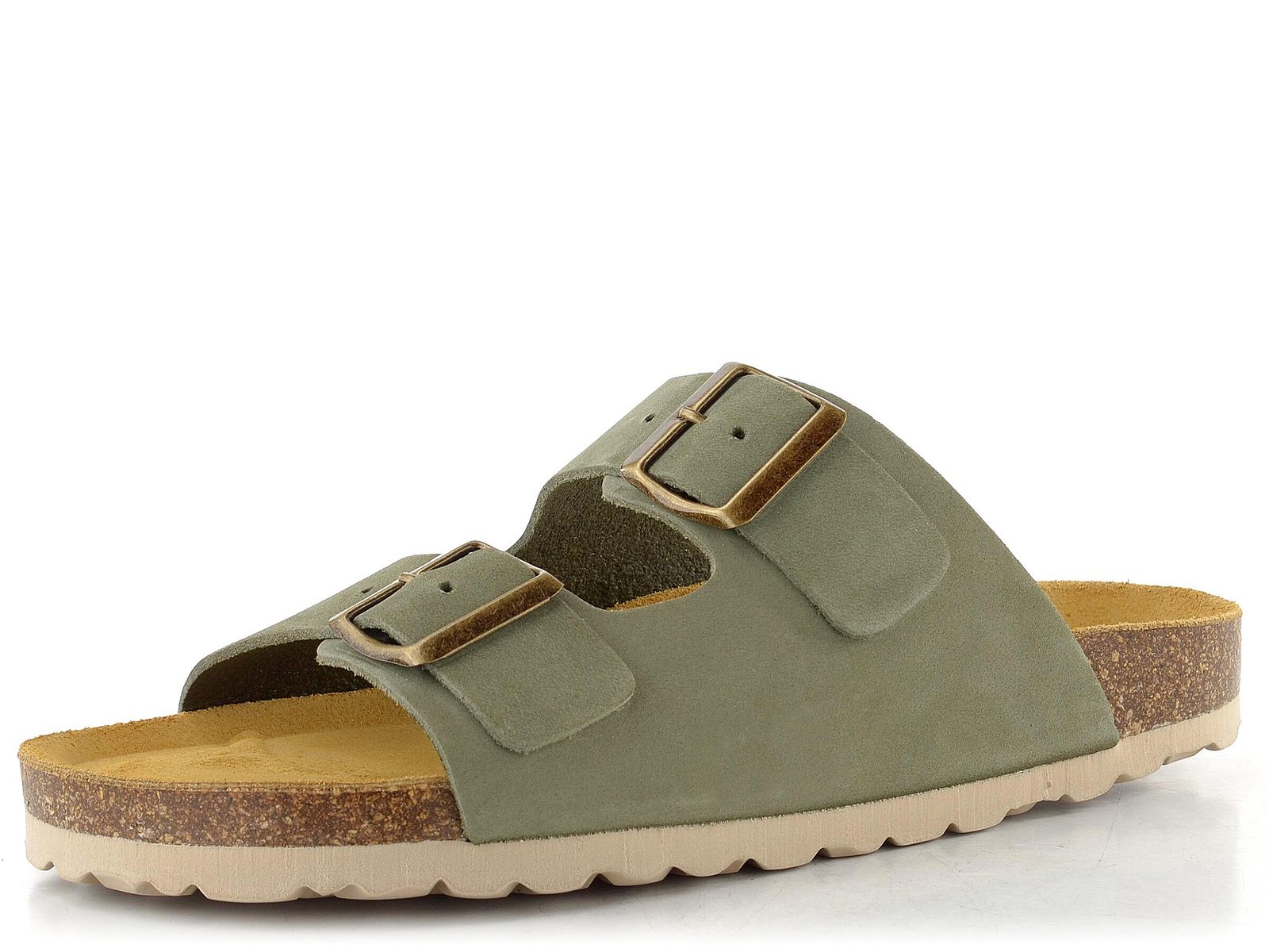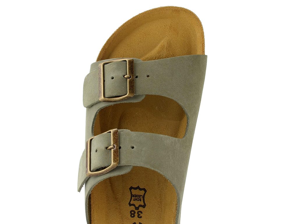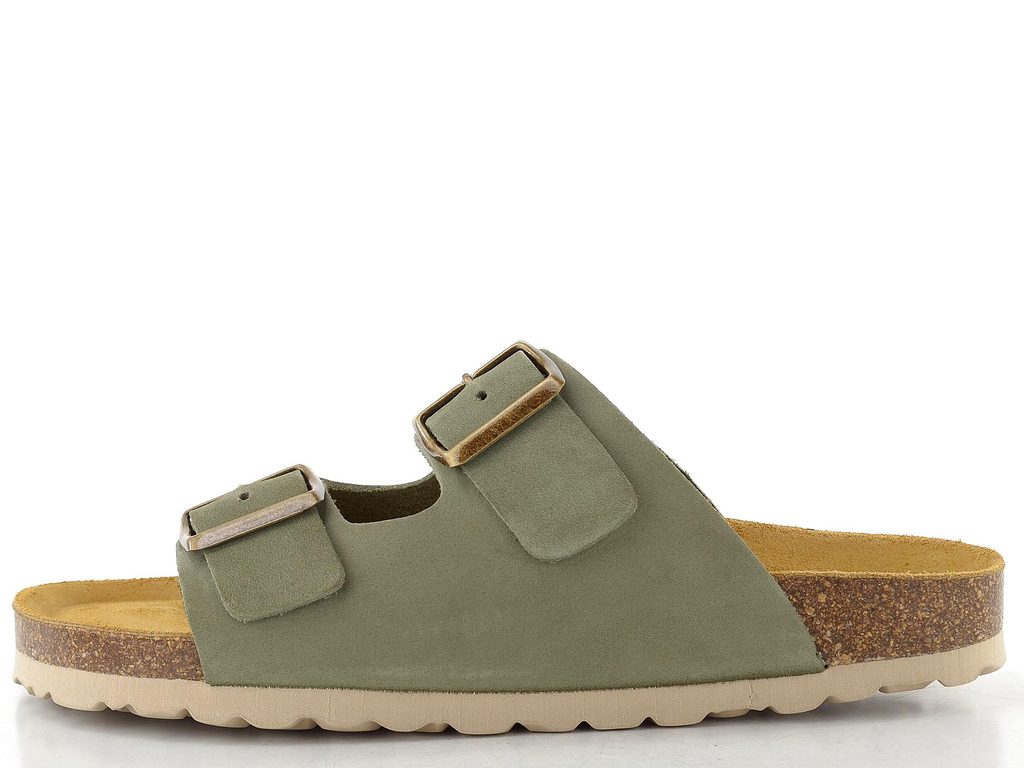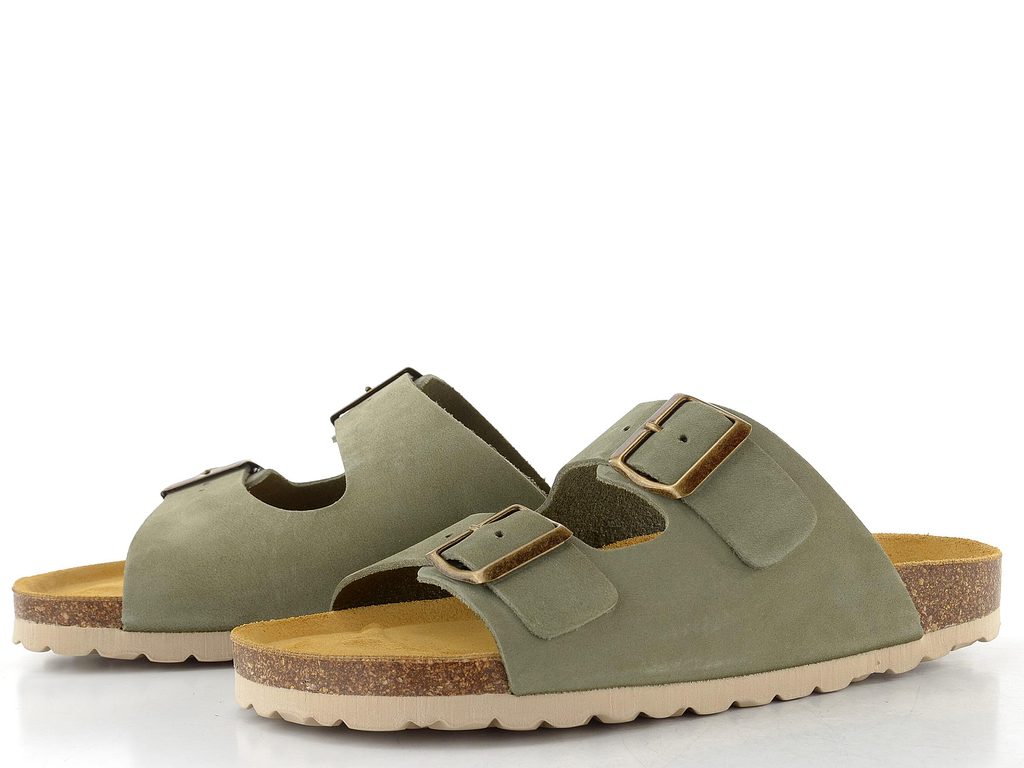 Dámské fuzbetové pantofle v šedozelené barvě se dvěma upínacími pásky a měkkou, tvarovanou stélkou.