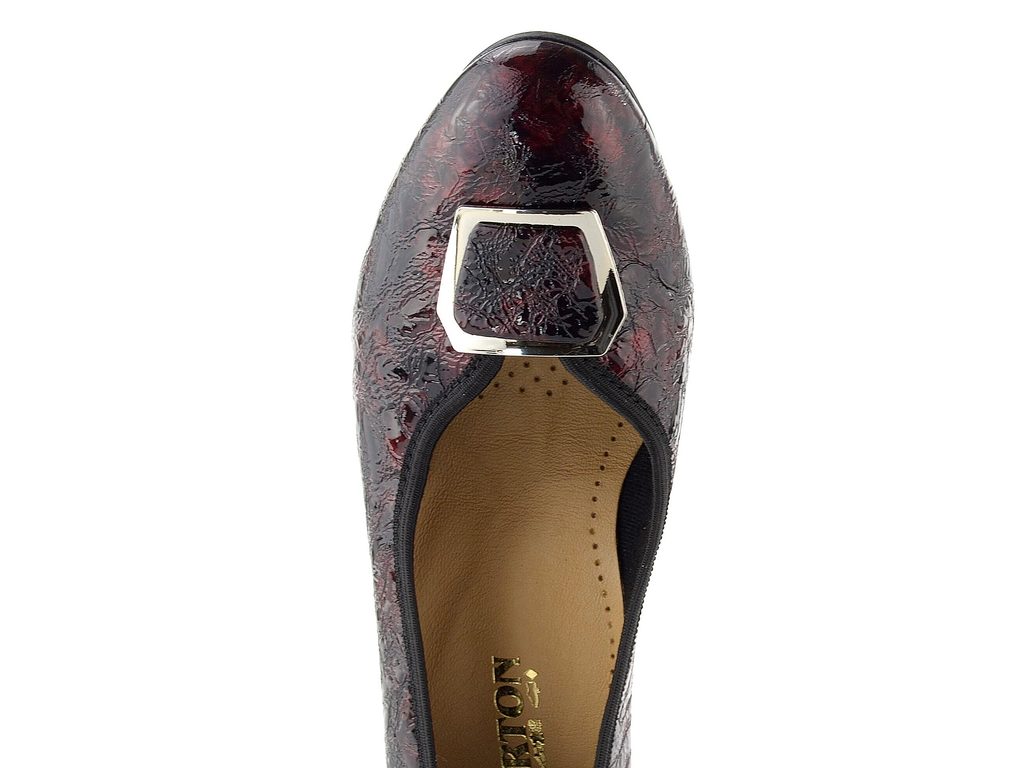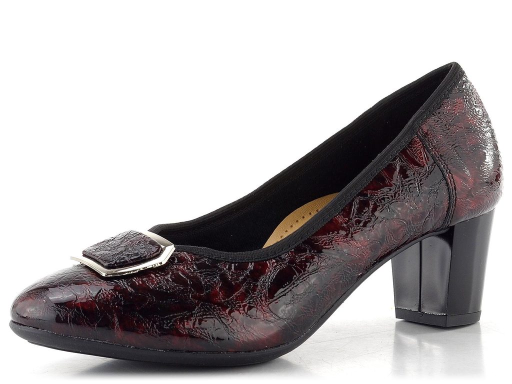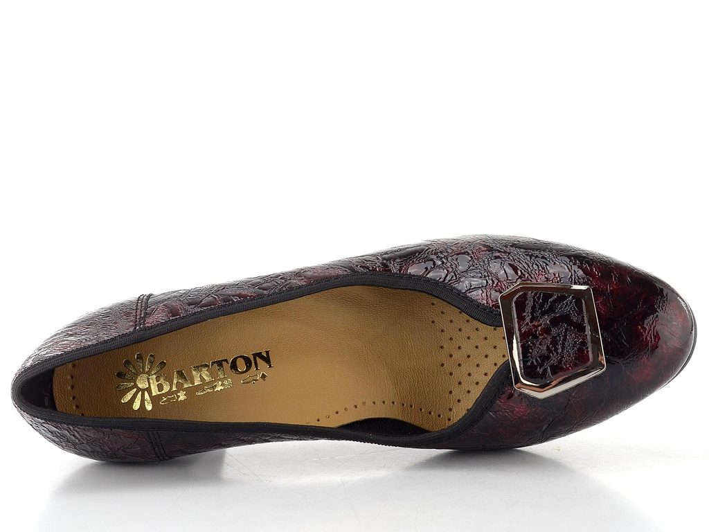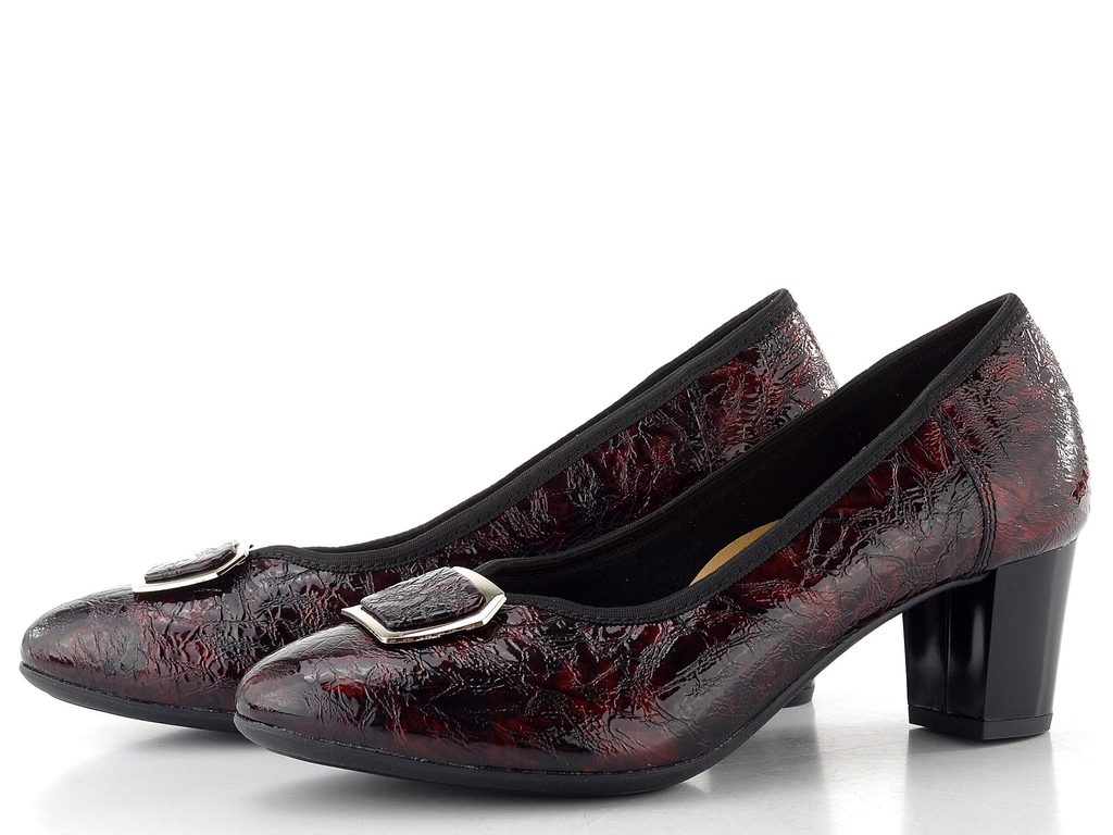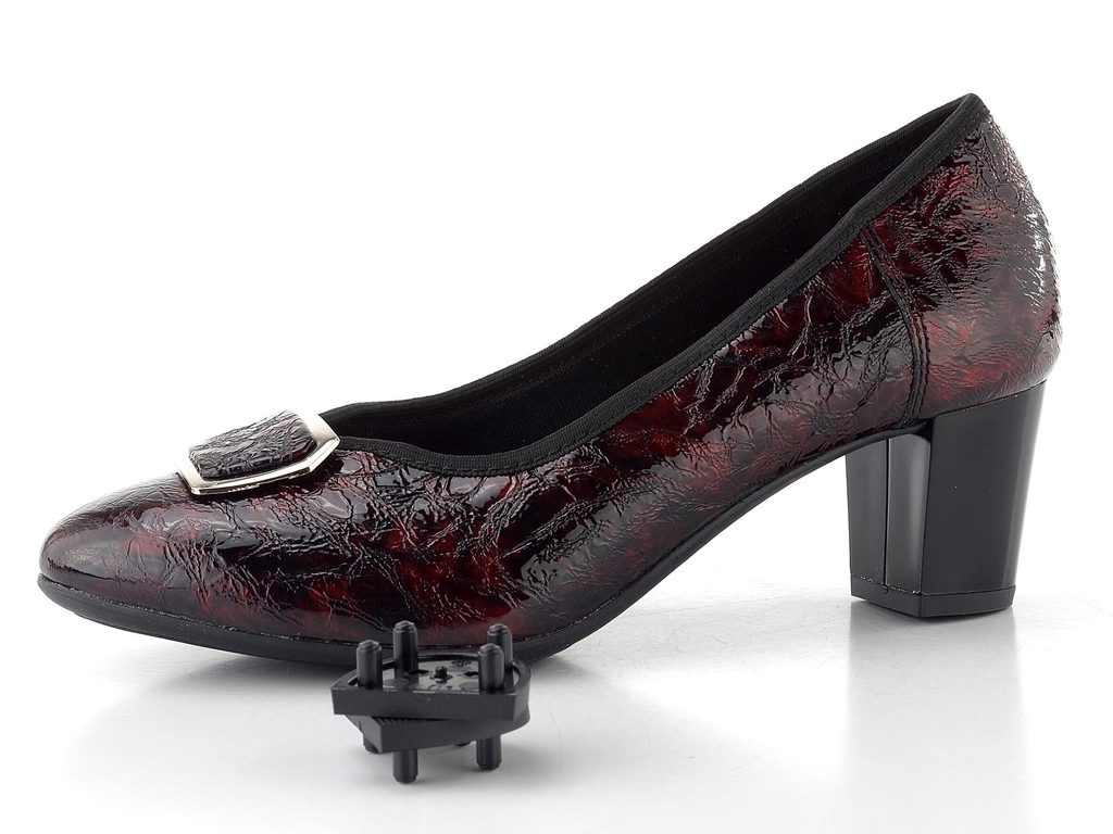 Dámské lodičky z mačkané lakované kůže s ozdobnou sponou a širokým podpatkem.