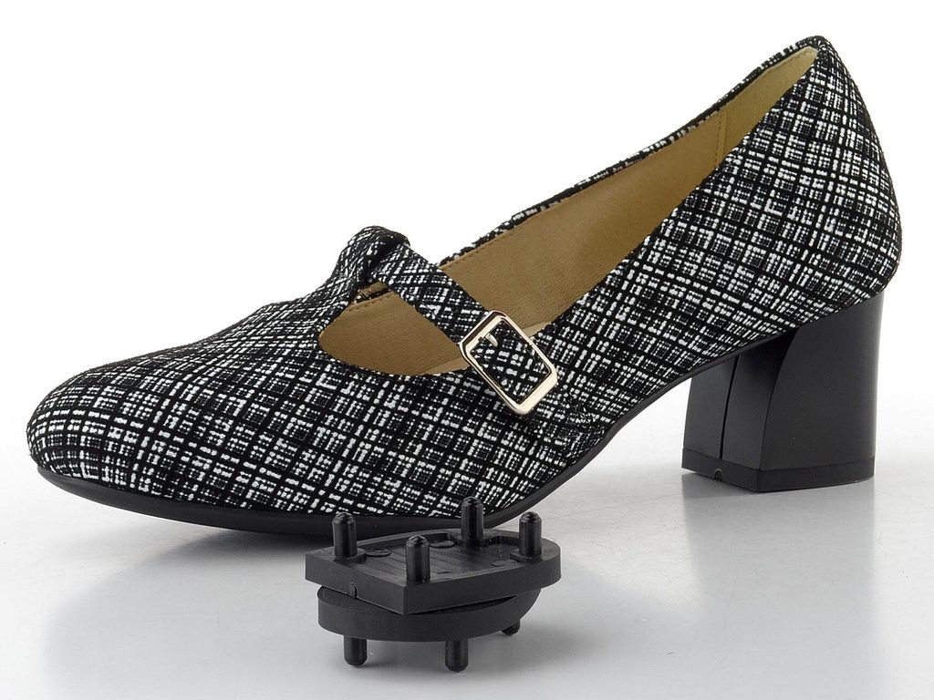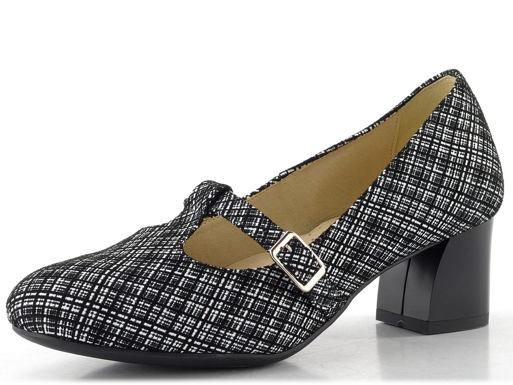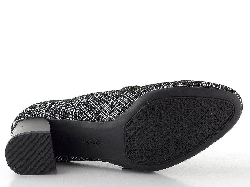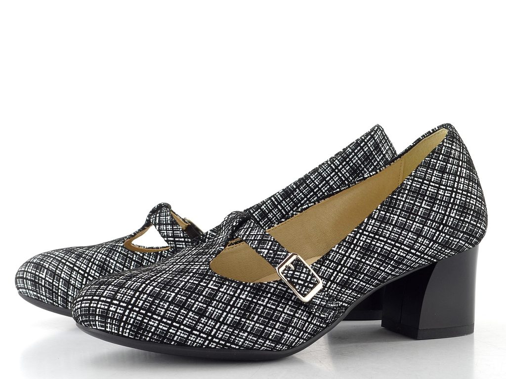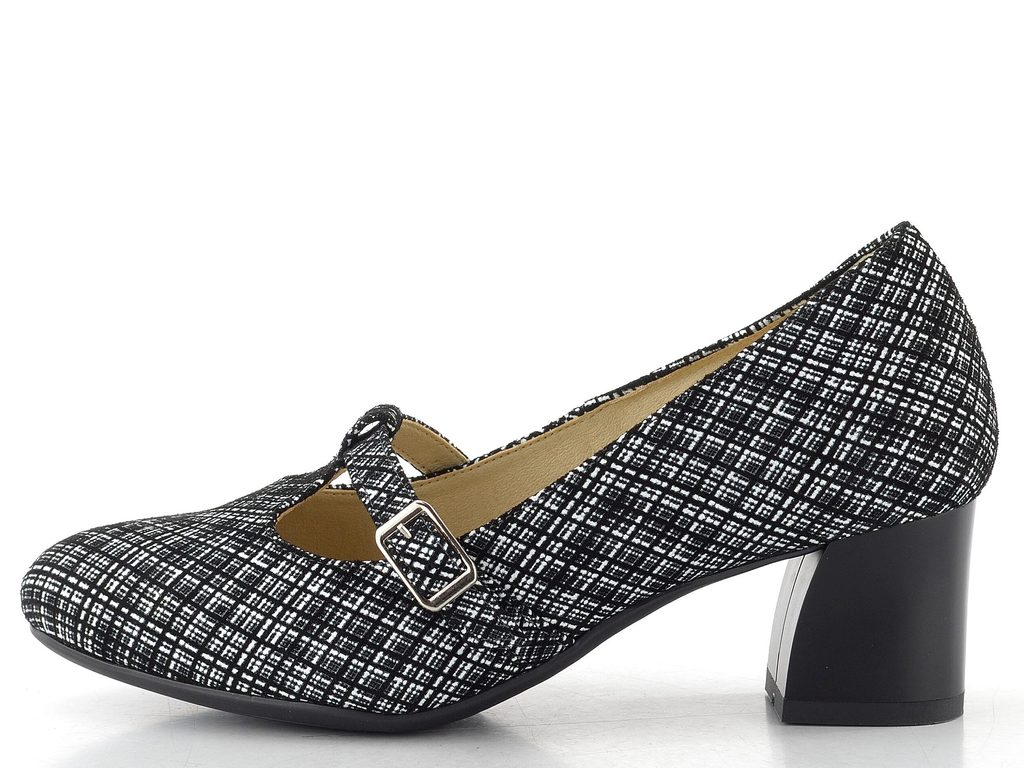 Dámské lodičky s černo-bílým vzorem, nastavitelným nártovým páskem a stabilním podpatkem.