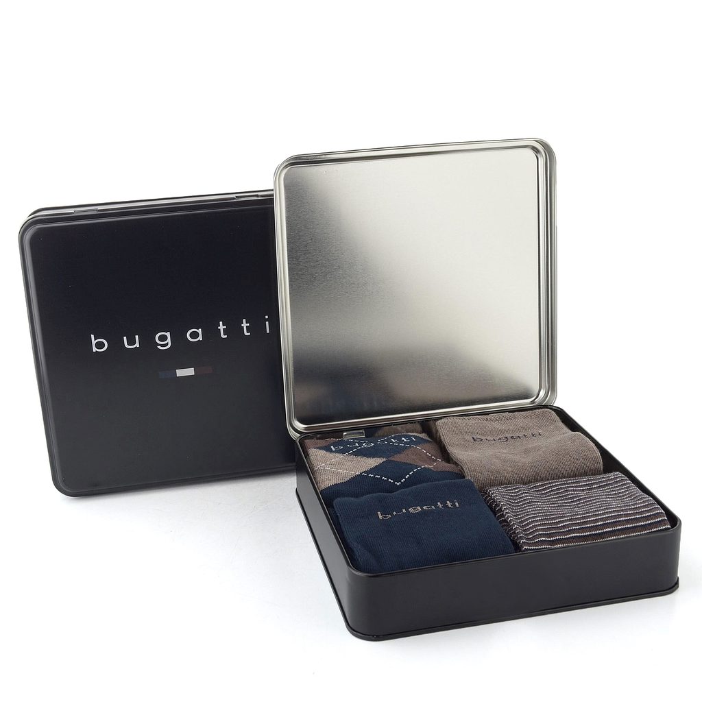 Stylovou krabičkou se čtyřmi páry ponožek od značky Bugatti rozhodně zabodujete, ať už kupujete sadu jako dárek nebo jen tak... pro radost či potřebu.