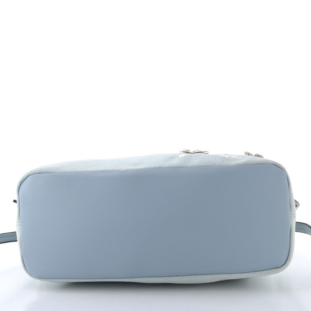 Dámská shopper kabelka z poddajné džínoviny, s přídavným crossbody popruhem a květinkami z broušených kamenů.