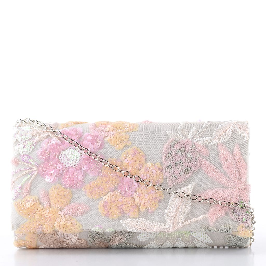 Dámské společenské psaníčko ve smetanové barvě s květinovým vyšívaným motivem zdobeným flitry.
