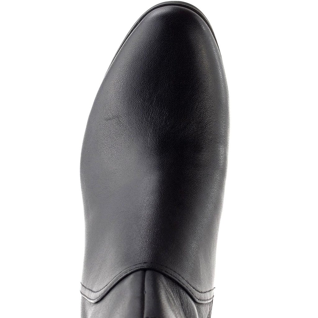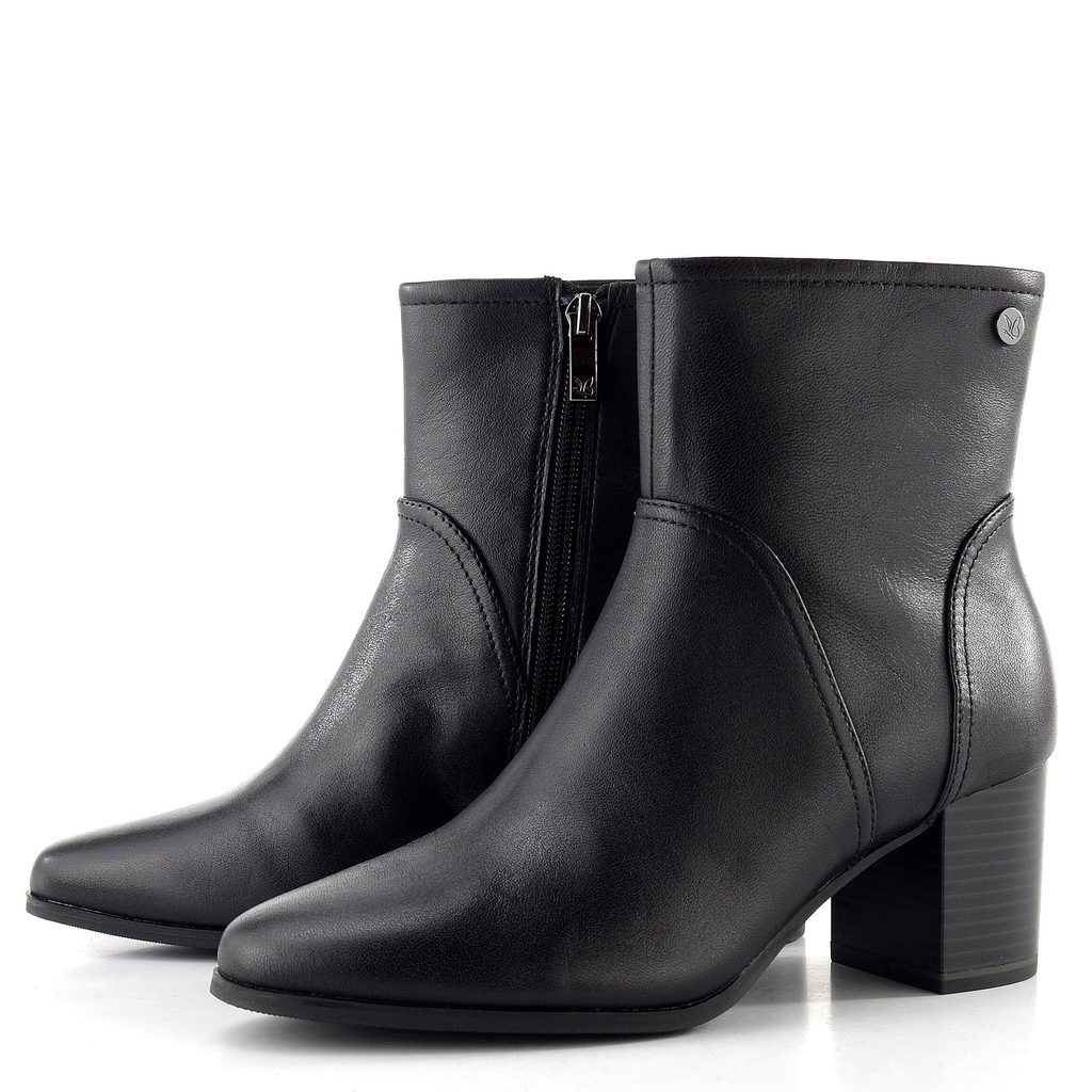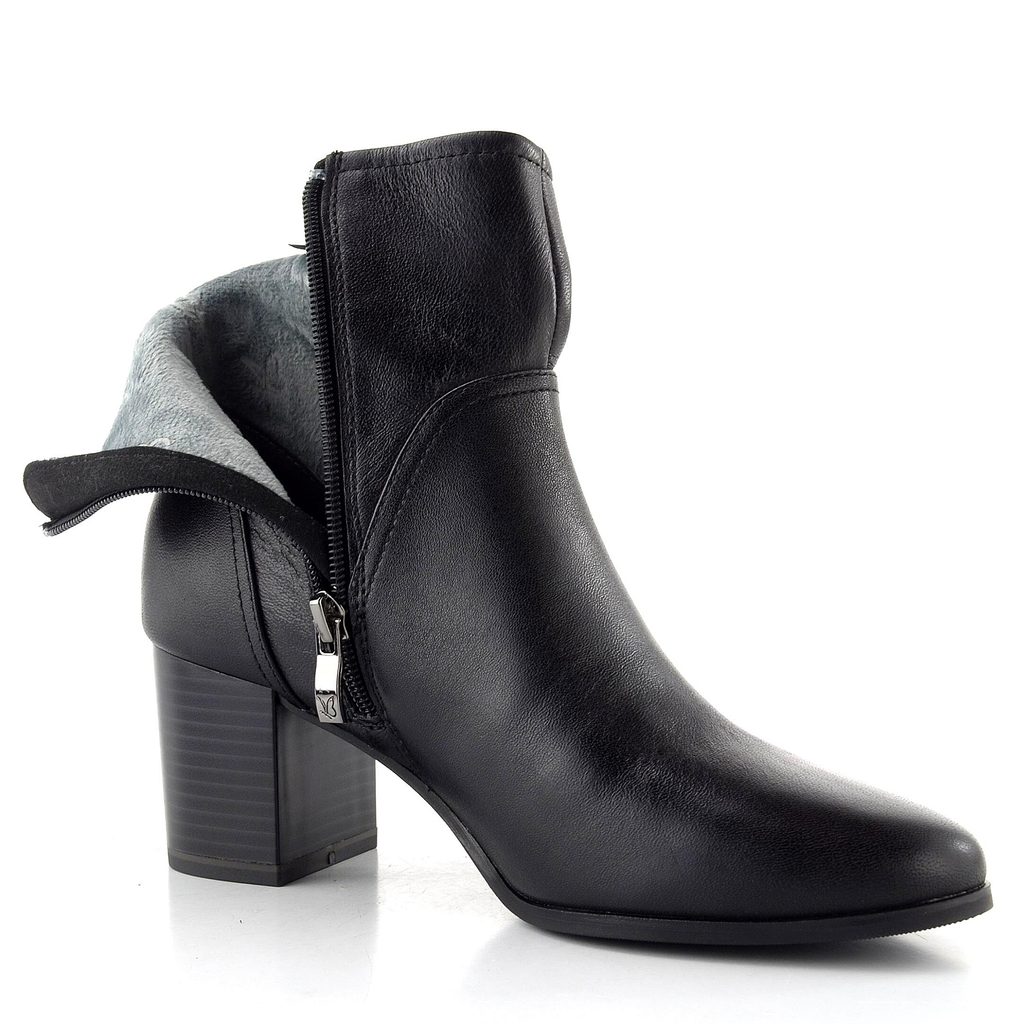 Dámský kožený kotník na podpatku v jednoduchém designu a elegantní černé barvě.