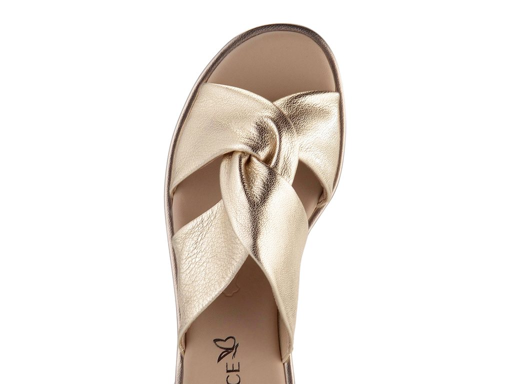Dámské komfortní pantofle s měkkými kříženými pásky v platinové barvě a nízkým podpatečkem.