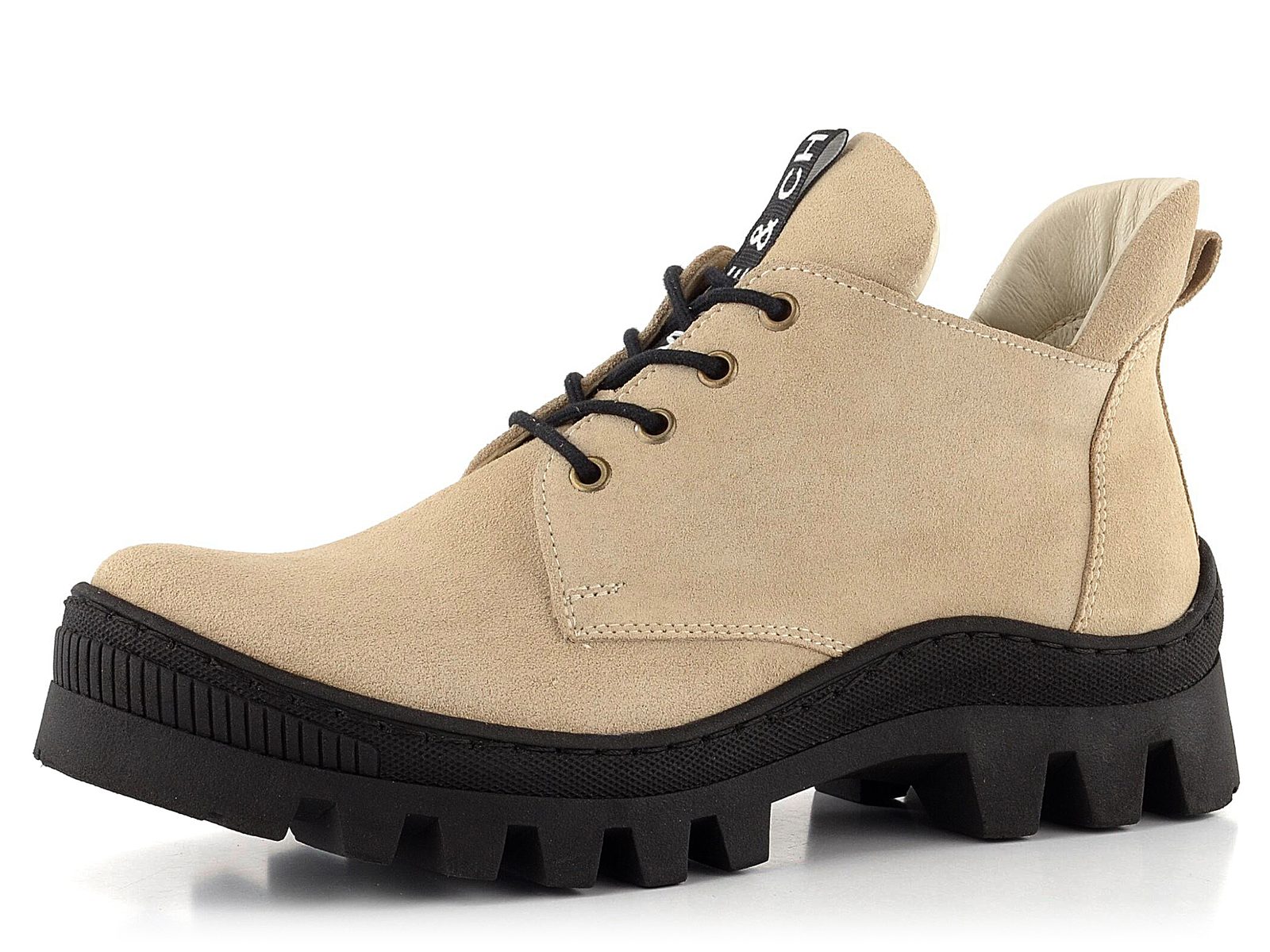 Zajímavé dámské polobotky ze semišové kůže v béžové barvě a na vyšší podešvi s traktorovým vzorkem.