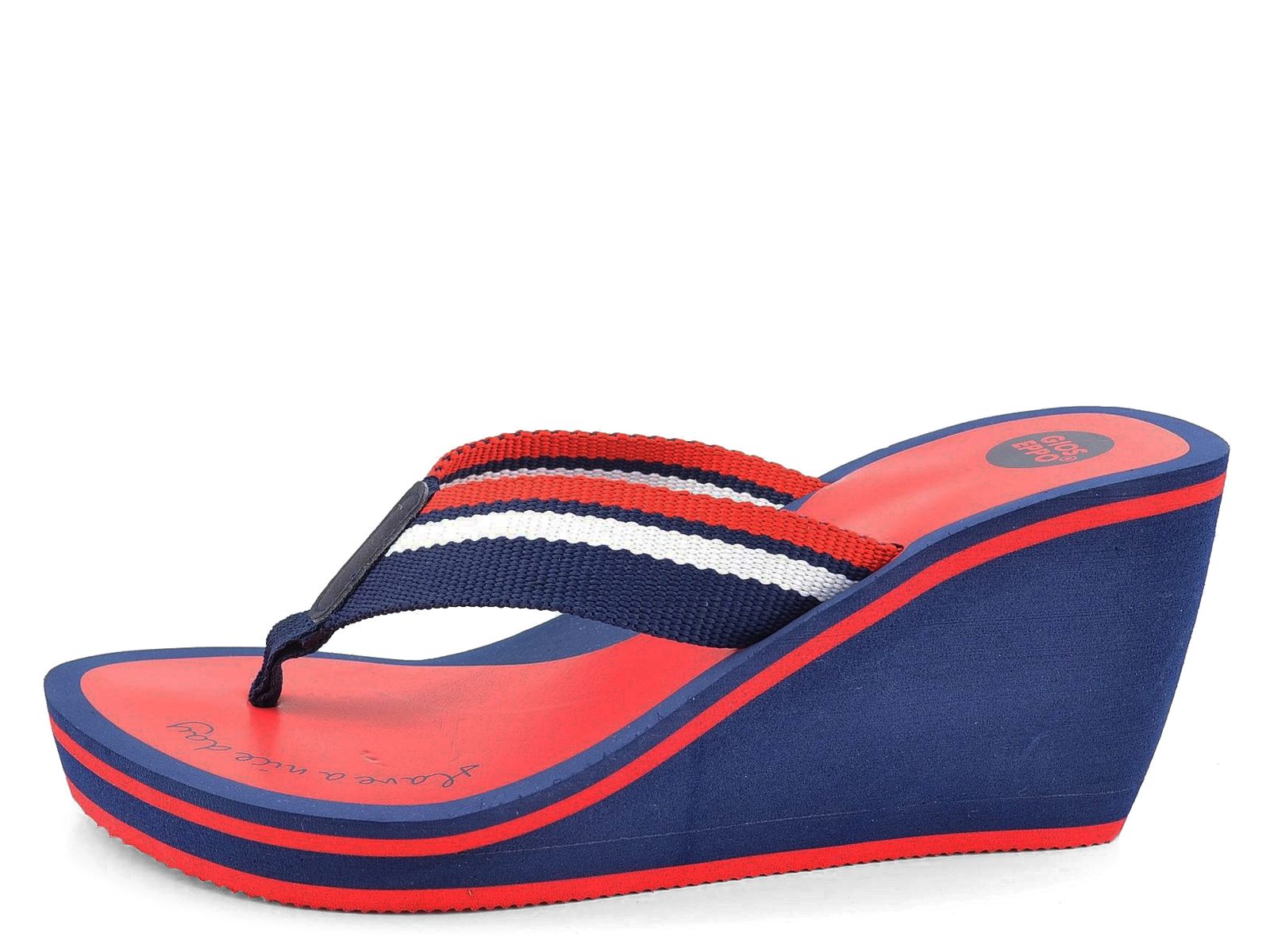 Ultralehké pantofle - žabky španělské značky Gioseppo jsou v dokonale sladěné kombinaci modré, červené a bílé barvy. Meziprstní pásek je textilní, lehká podešev s pohodlným klínkem dokonale koresponduje s vrchovým materiálem.