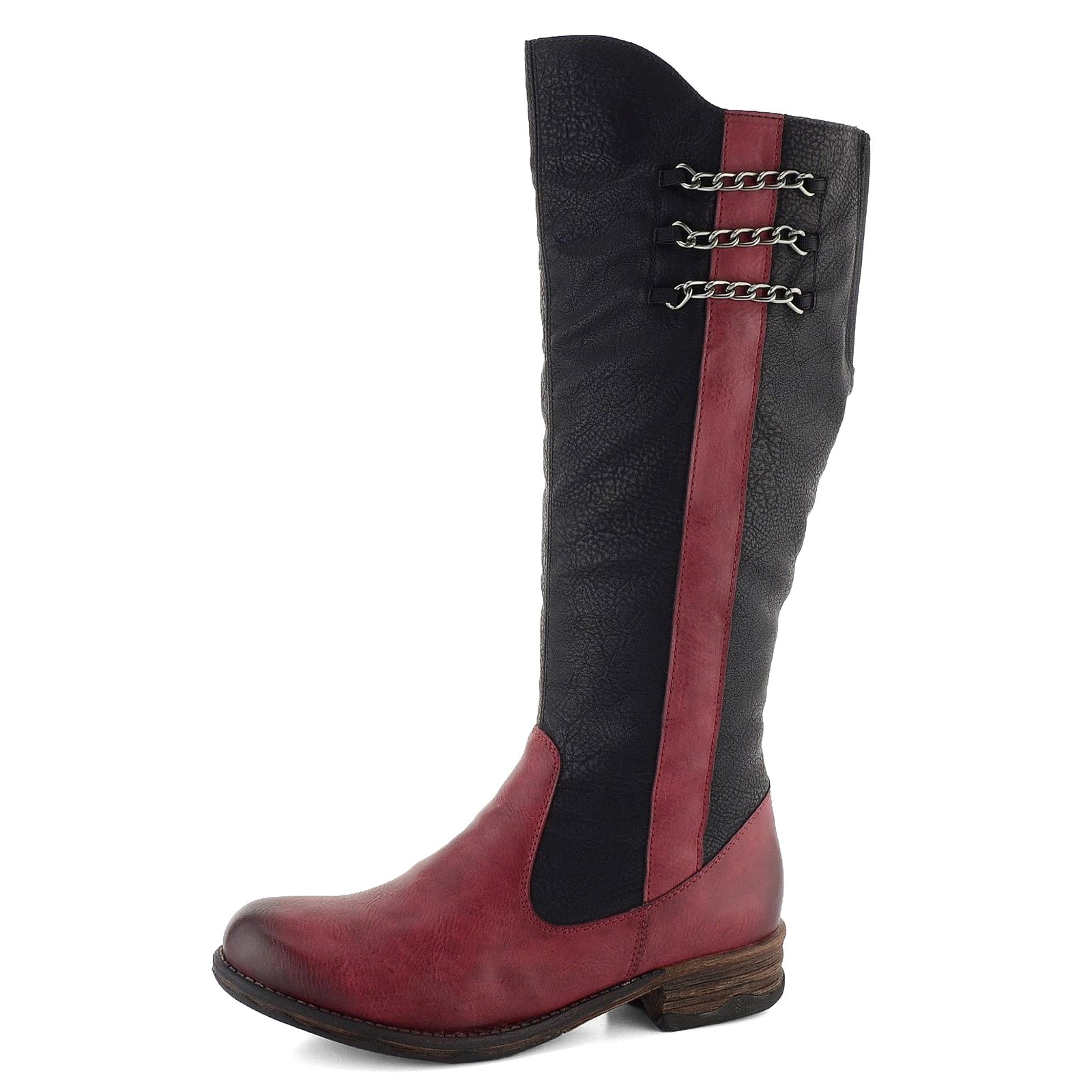 Vyteplené dámské kozačky od značky Rieker v červeno-černém provedení s postranními řetízky.