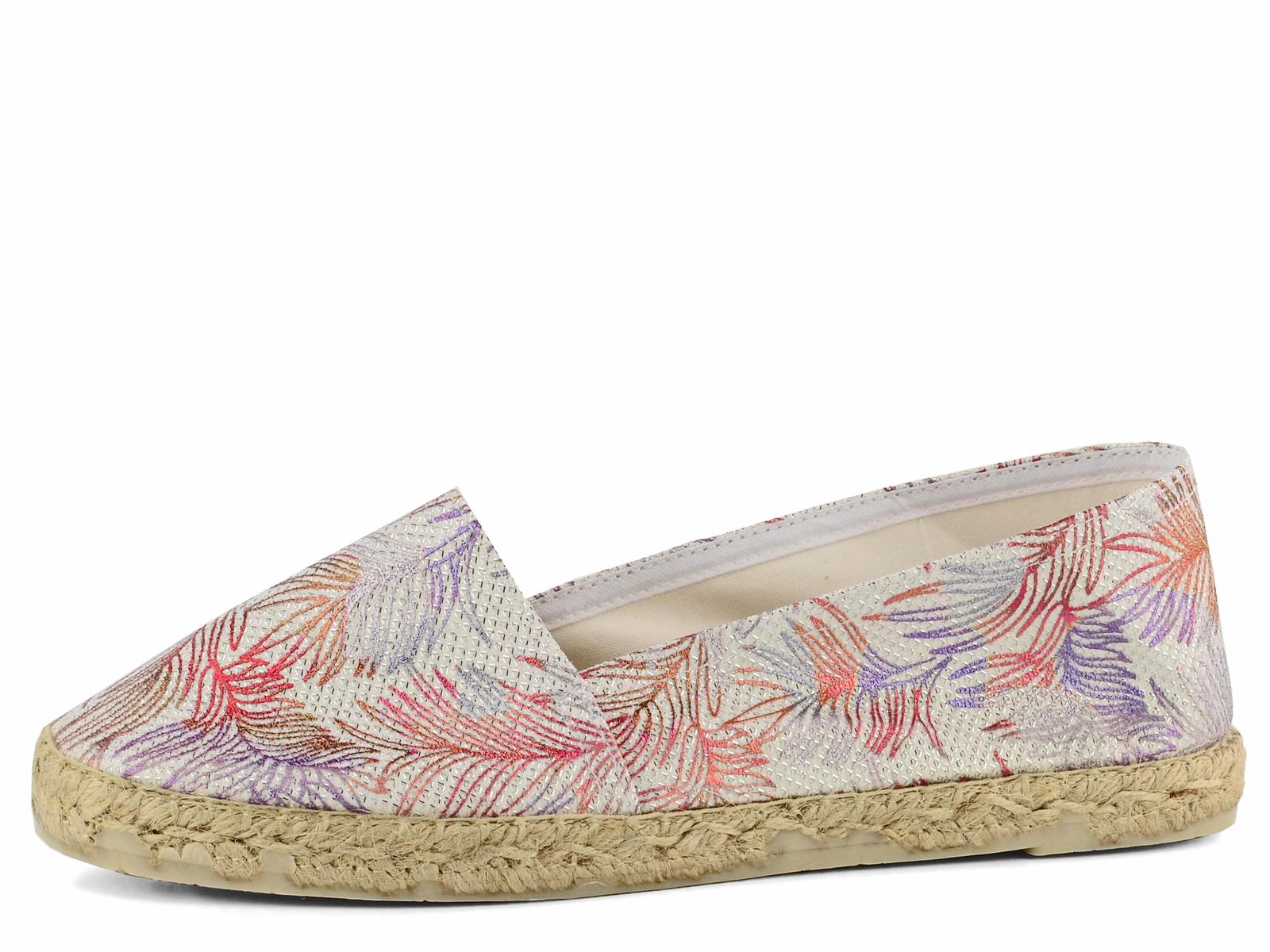 Dámské něžné espadrilky z plátnoviny s lurexem a s barevným potiskem, na podešvi ze splétané juty.