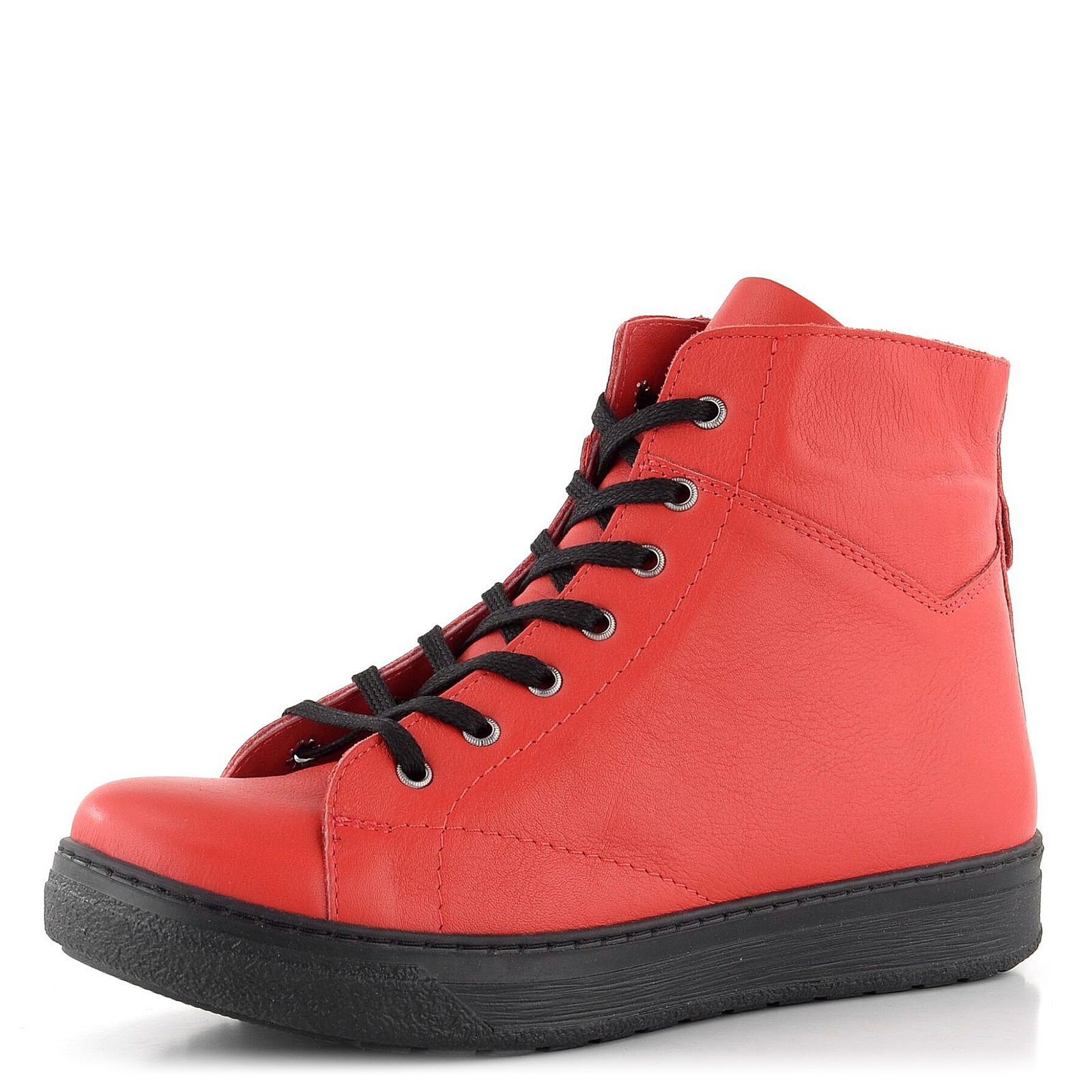 Dámský šněrovací kotník z poddajné hladké kůže v červené barvě, s teplejší podšívkou a rovnou podešví.