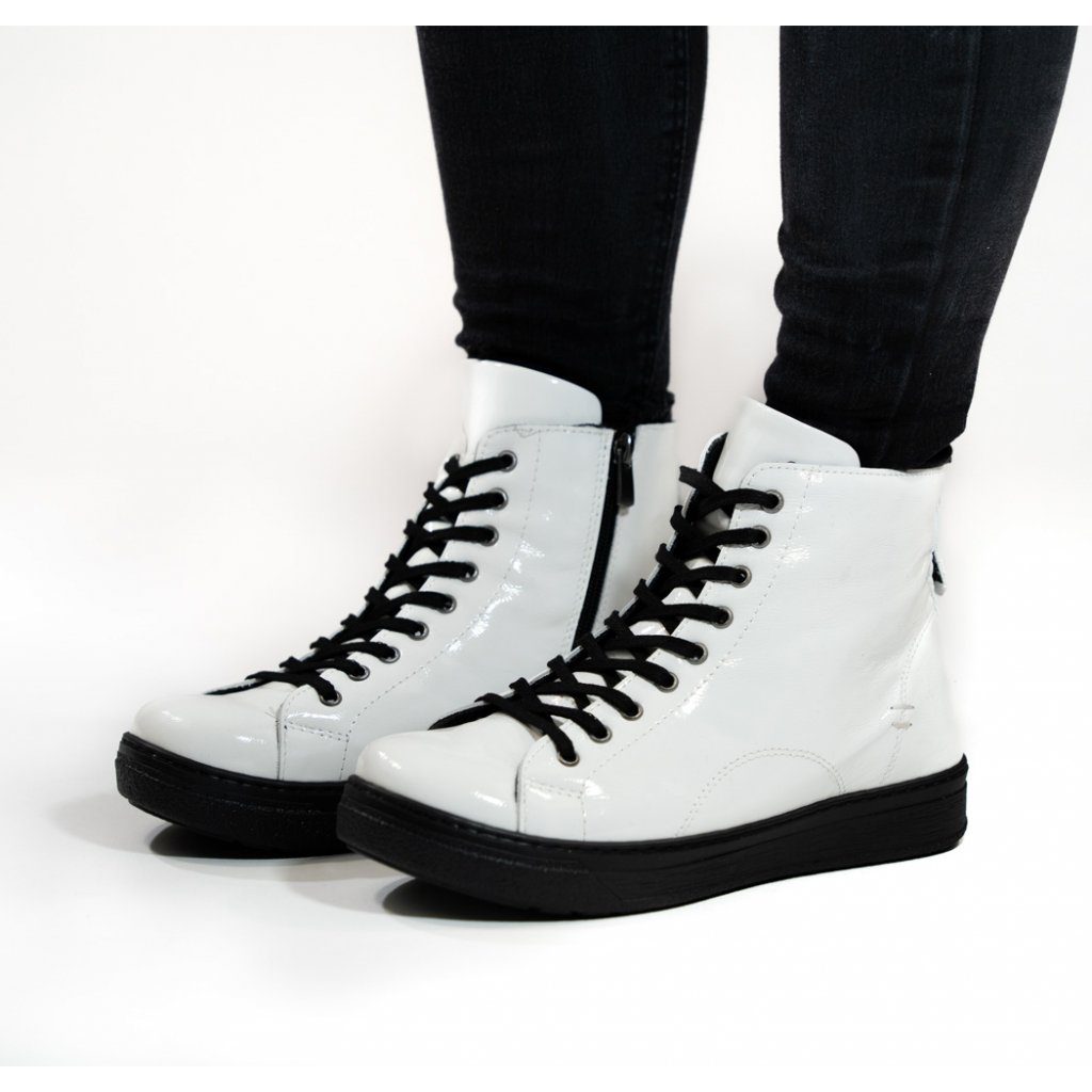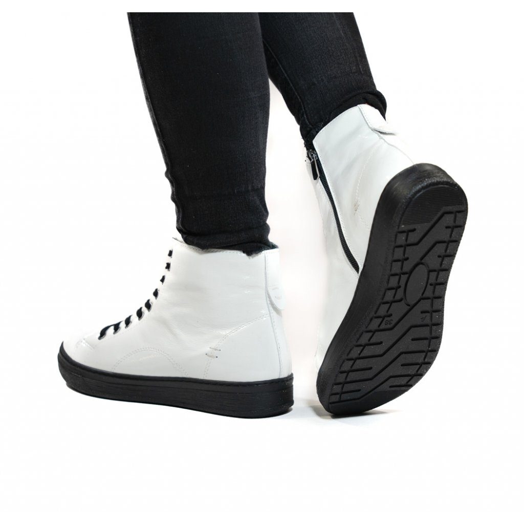 Dámský šněrovací kotník z lakované kůže v bílé barvě, s teplejší podšívkou a rovnou podešví.