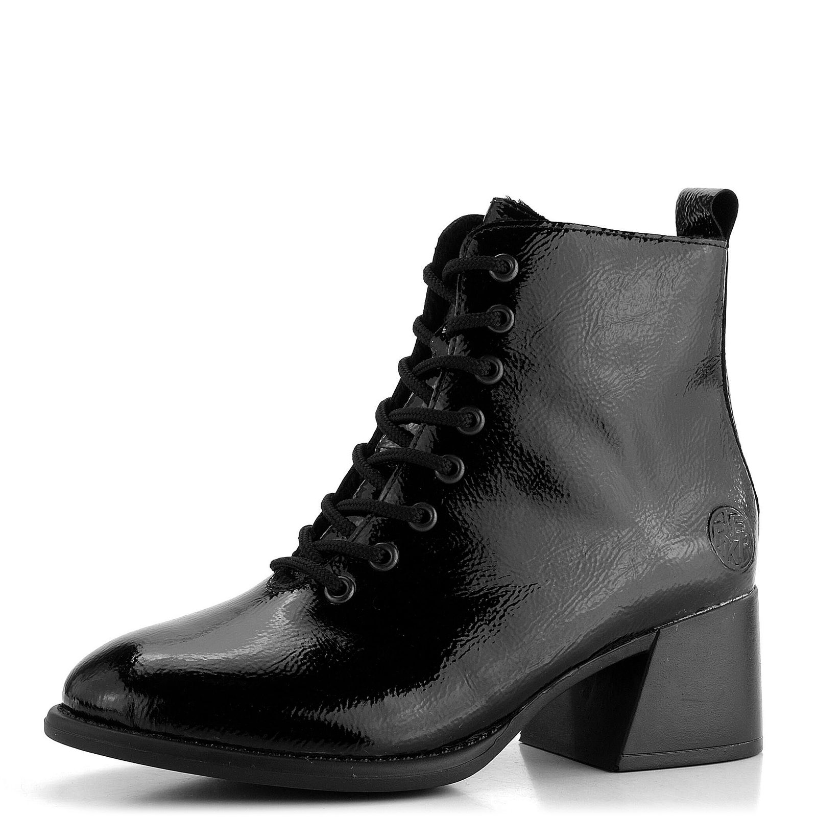 Dámský kožený kotník v lakovaném provedení se širokým podpatkem od značky Rieker.