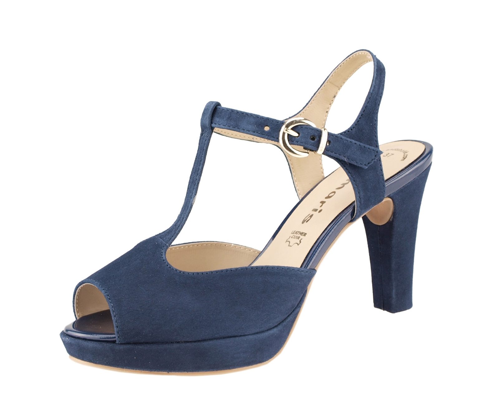Dámské elegantní sandály Tamaris jsou vhodné jako společenské, ale i pro běžné nošení do zaměstnání, do města apod. Sandály jsou zpracovány z broušené usně v tmavě modrém odstínu a ve velmi oblíbeném a slušivém "téčkovém" tvaru. Vnitřní podšití pásečků je z imitace usně, nášlapná stélka je vyměkčena pro příjemný došlap. Platforma je vysoká 2cm, stabilní podpatek se zabudovaným systémem ANTIshokk má výšku 9,5cm.
