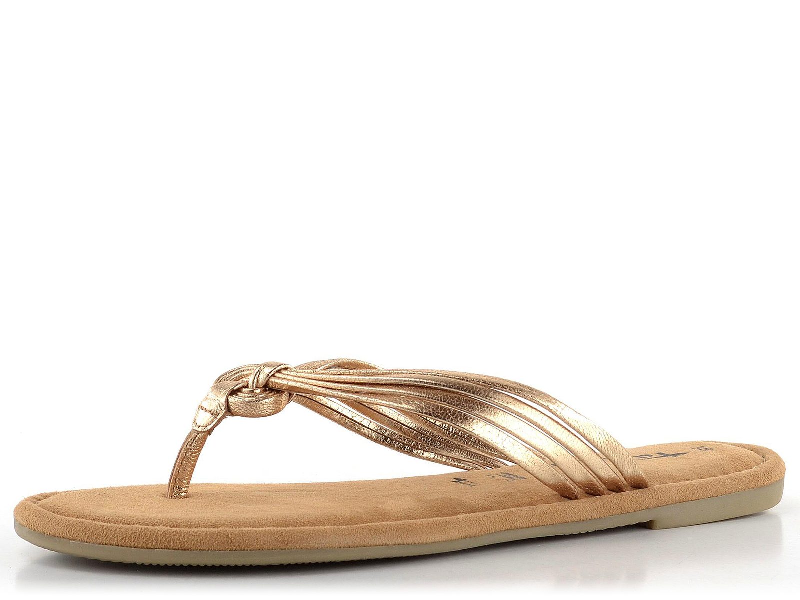 Dámské módní žabky z metalické kůže ve zlaté barvě.
