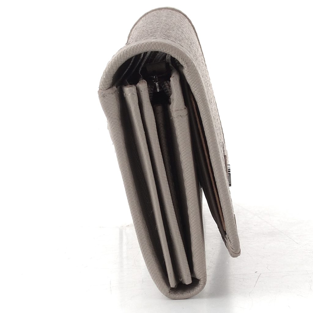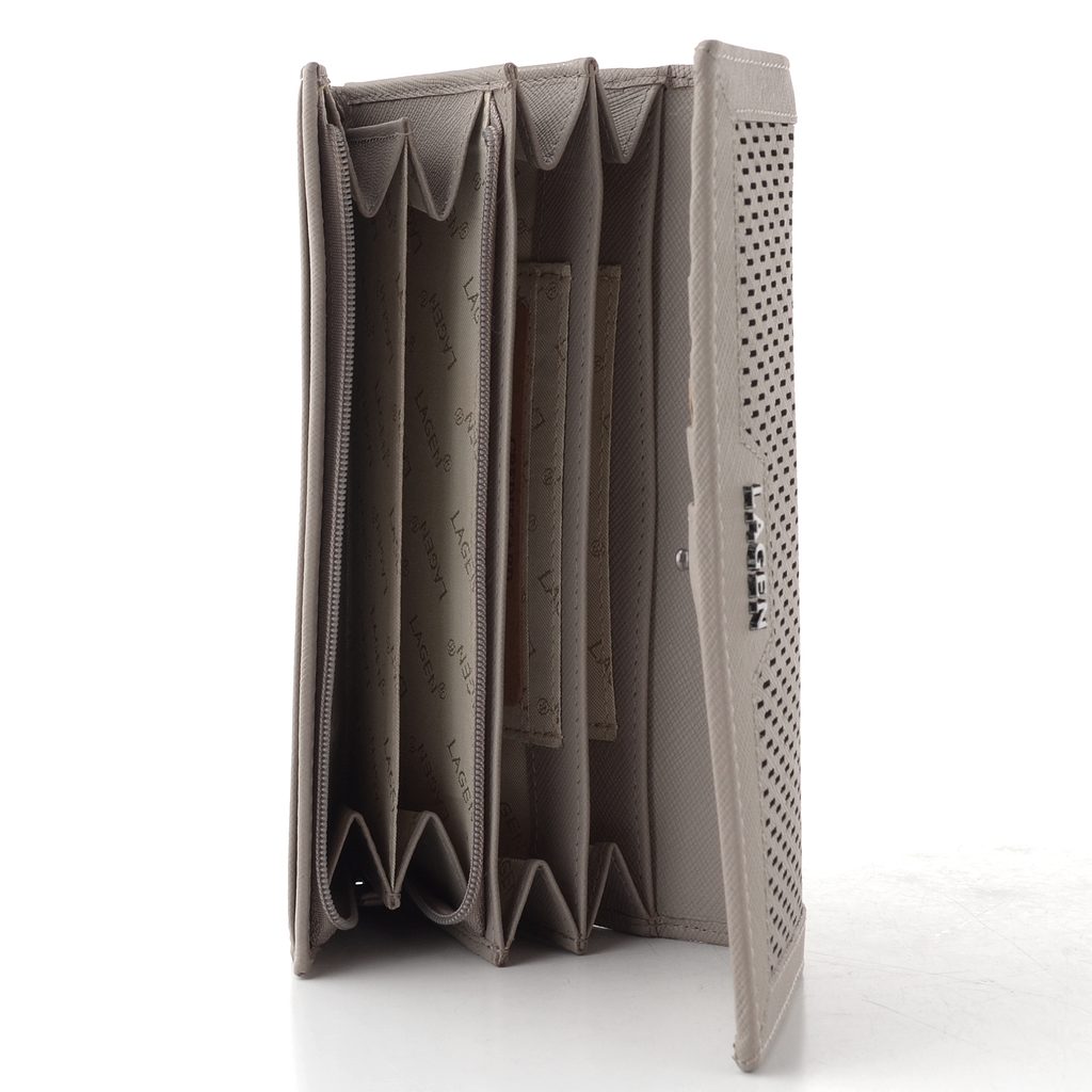Dámská klopnová kožená peněženka v šedobéžové barvě s prořezávaným vzorem.