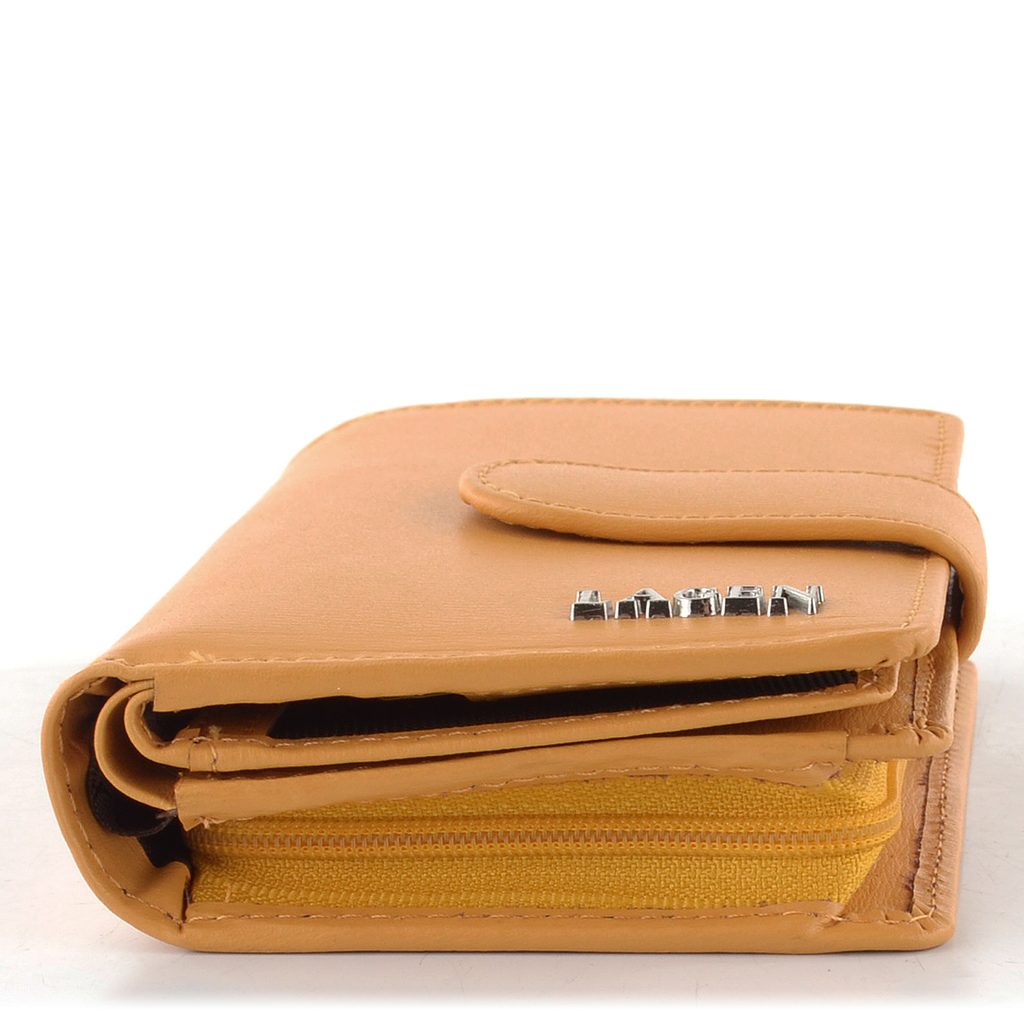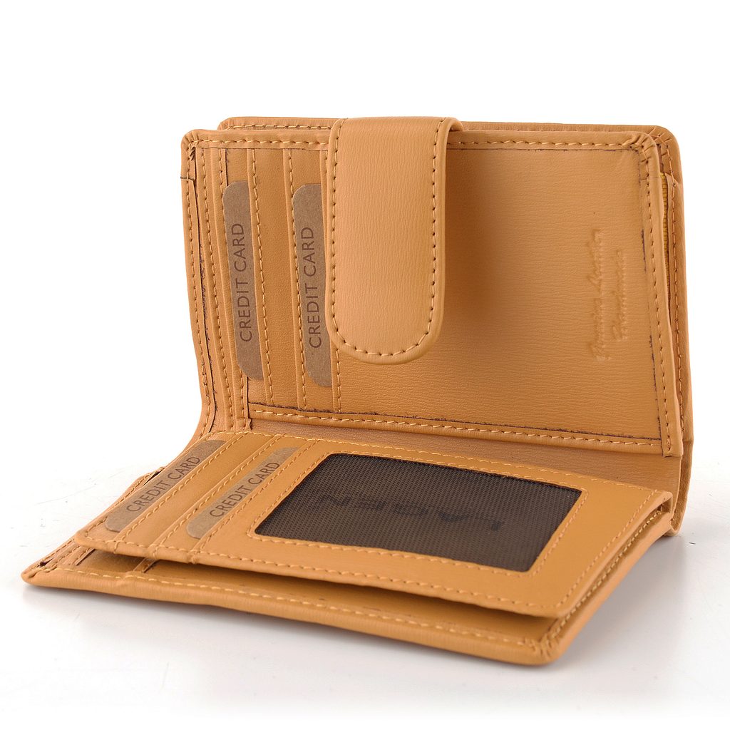 Dámská praktická kožená peněženka v okrově žluté barvě se zápinkou a samostatnou kapsou na mince.