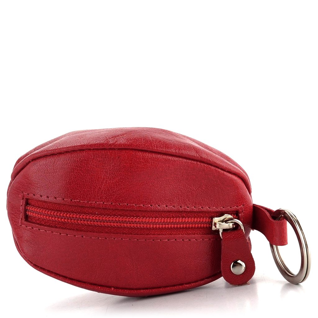 Červená kožená klíčenka se zipovými kapsičkami a dvěma kroužky.