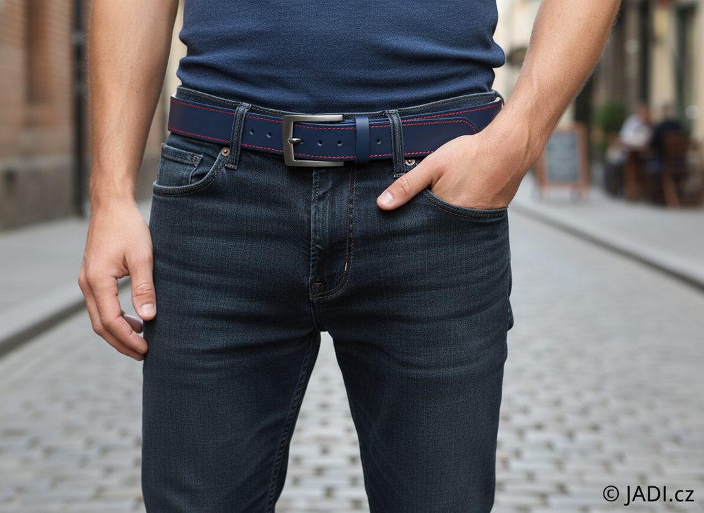 Pánský kožený opasek v tmavě modré barvě s kontrastním červeným štepováním.