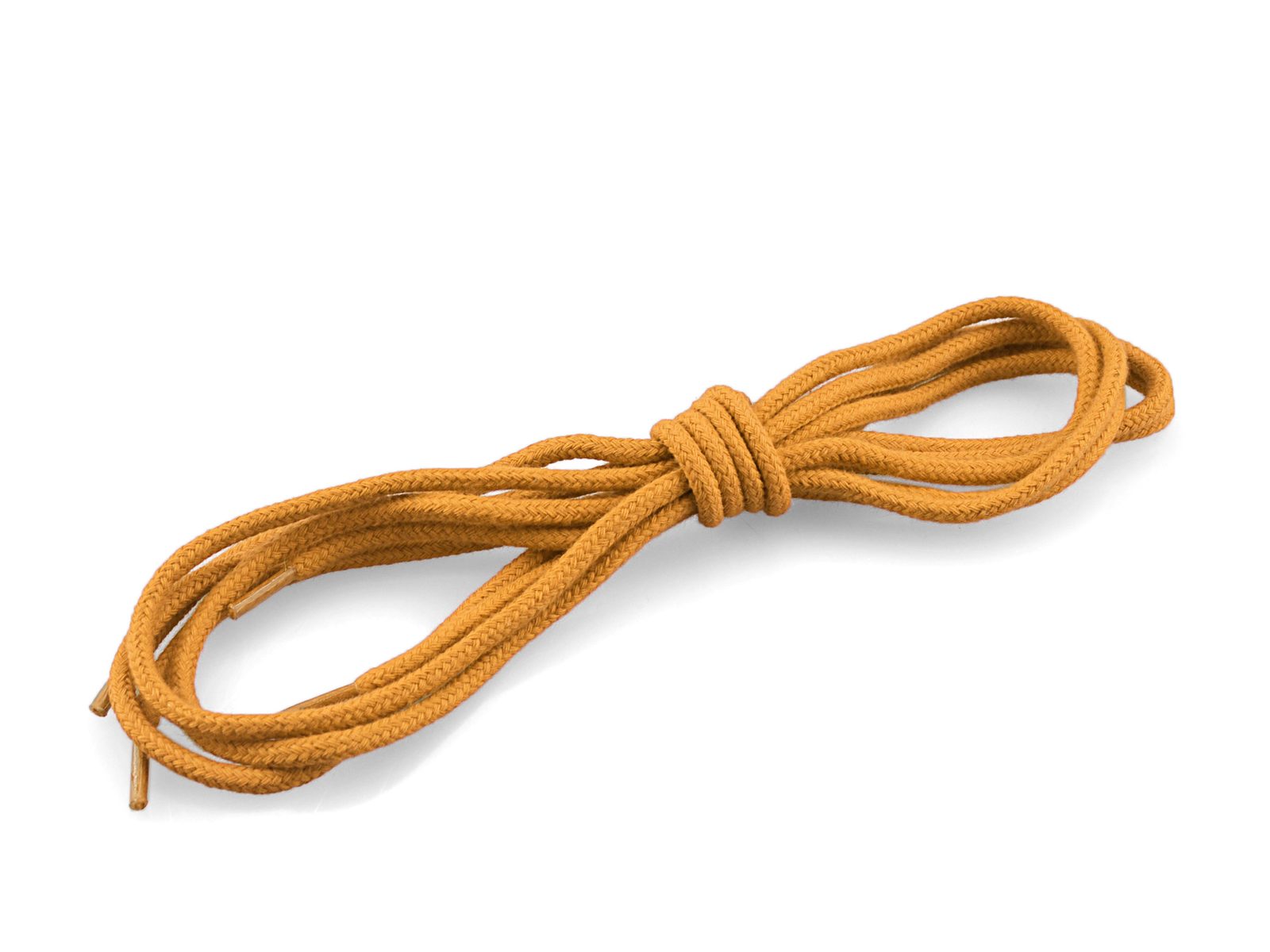 Silnější bavlněné tkaničky s kulatým profilem, které dobře drží zavázání a jsou ve skořicové barvě.