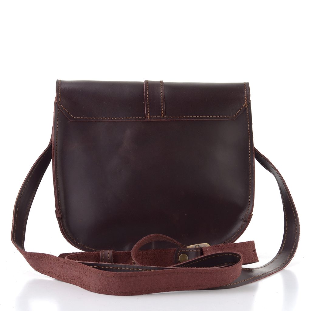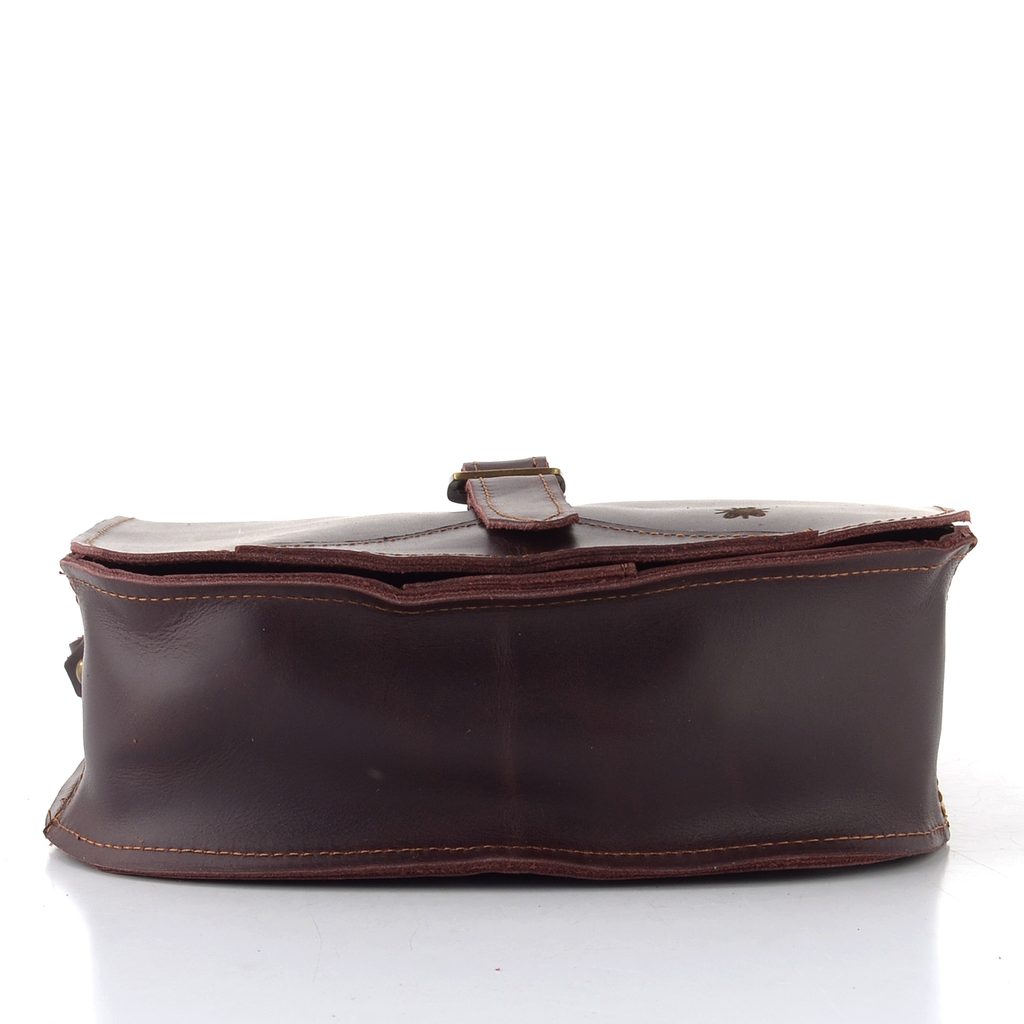 Luxusní dámská klopnová kabelka z poddajné kůže v tmavé vínové barvě s nastavitelným crossbody popruhem.
