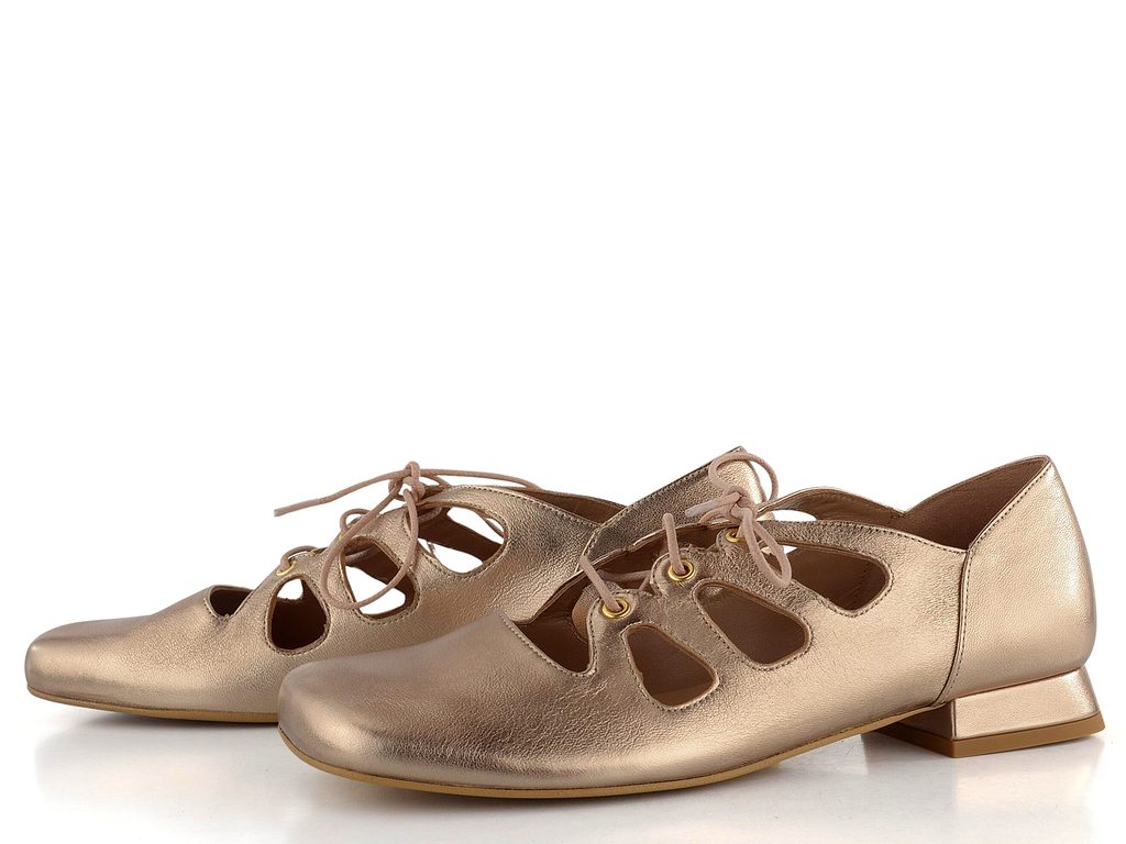 Lehce extravagantní a zcela vyjímečné otevřené polobotky z metalické kůže, se šněrováním a nízkým podpatečkem.