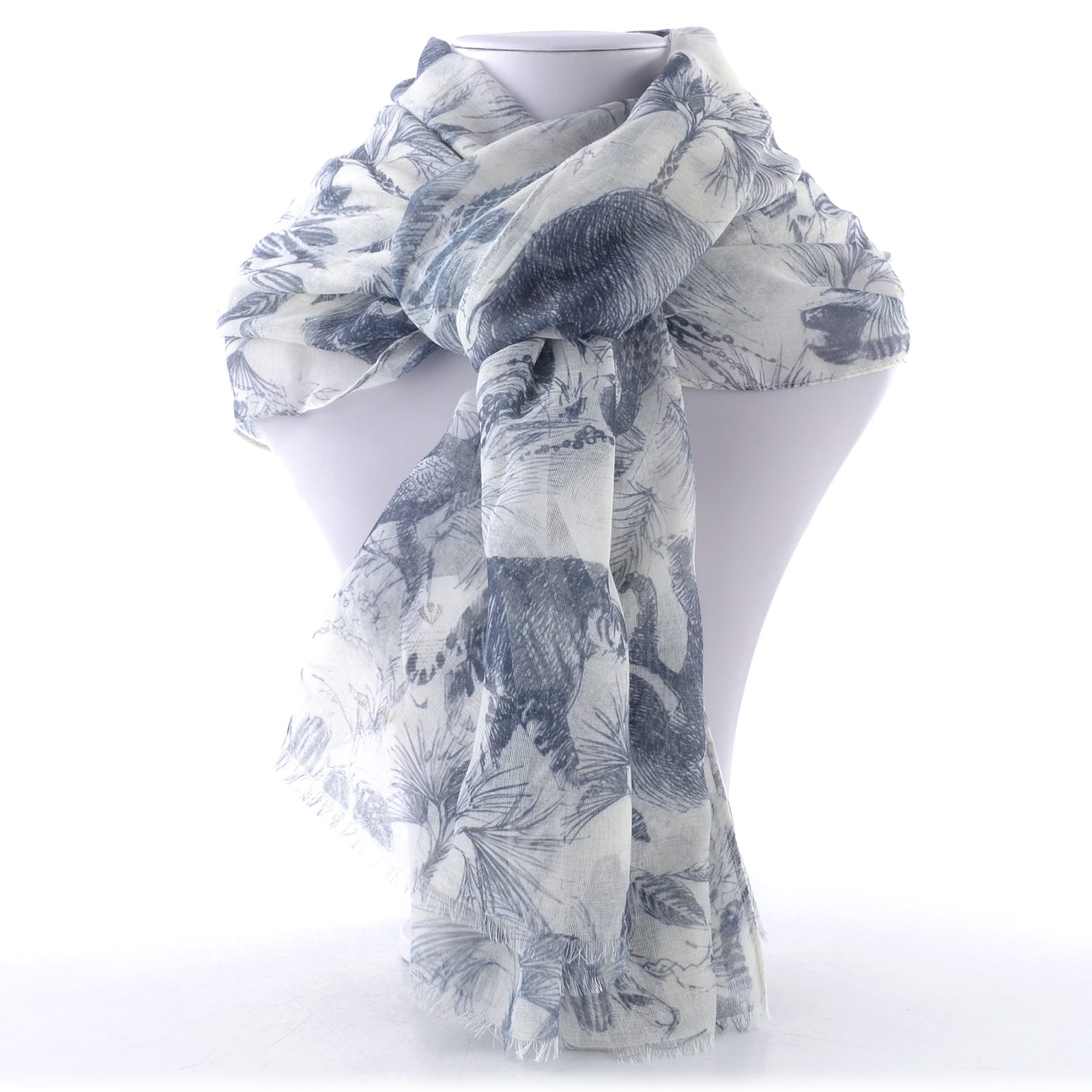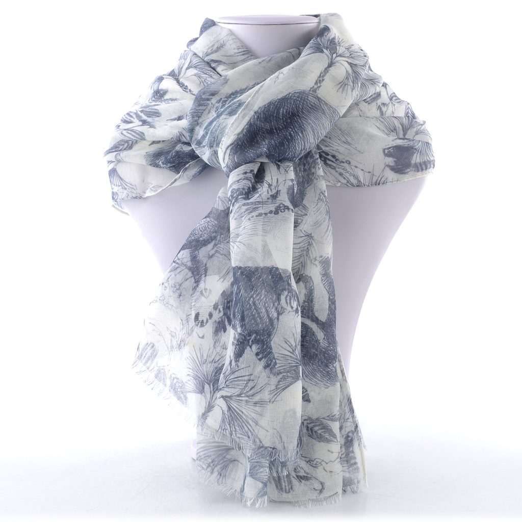 Luxusní šál z udržitelné kolekce Sustainability, vyrobený z recyklovaného polyesteru a zdobený ruční kresbou divokých zvířat.
