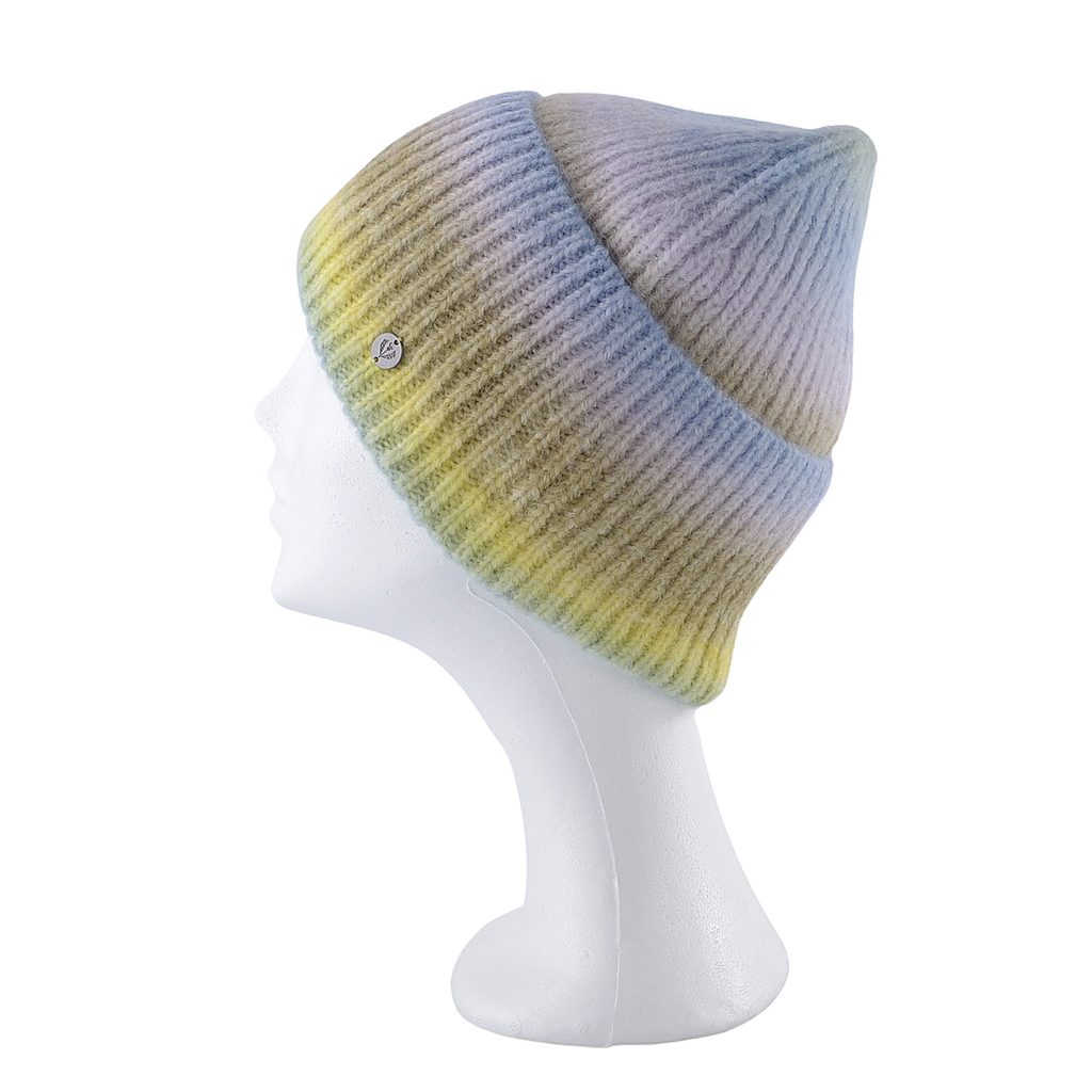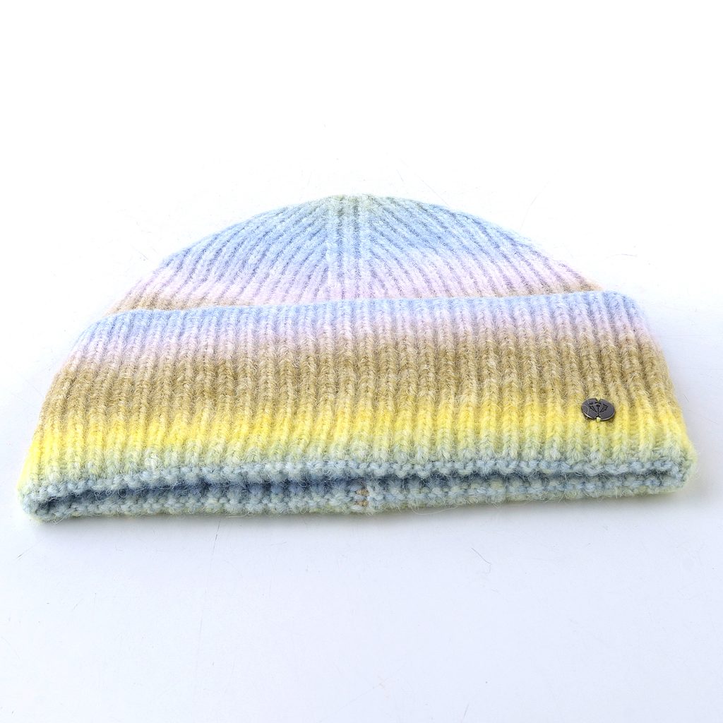 Pletená dámská čepice s barevným gradientem.