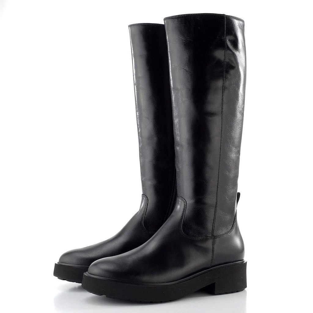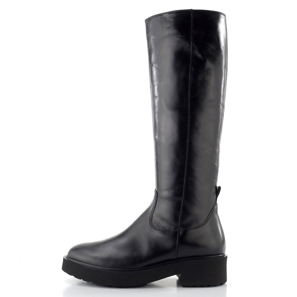 Dámské kozačky z leštěné kůže v černé barvě, bez vnitřního zateplení a na vysoké odlehčené platformě.