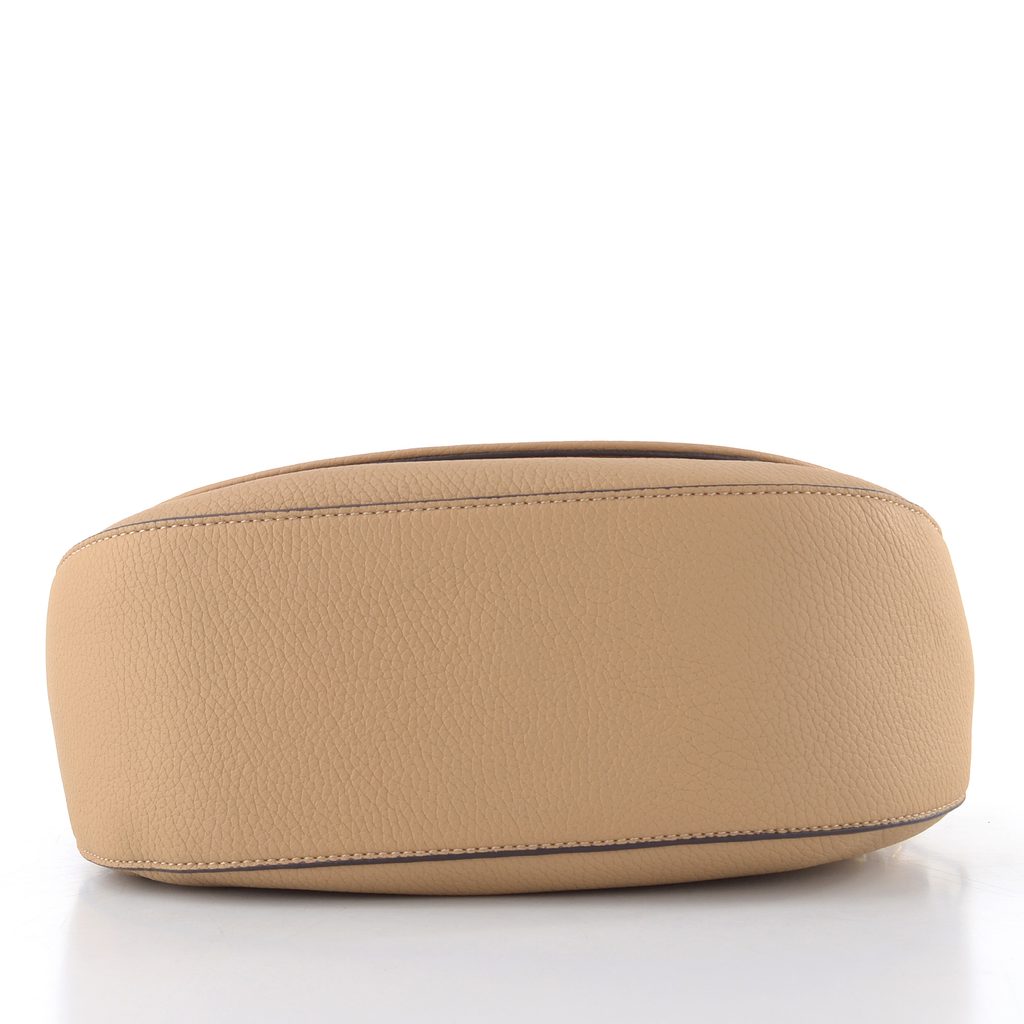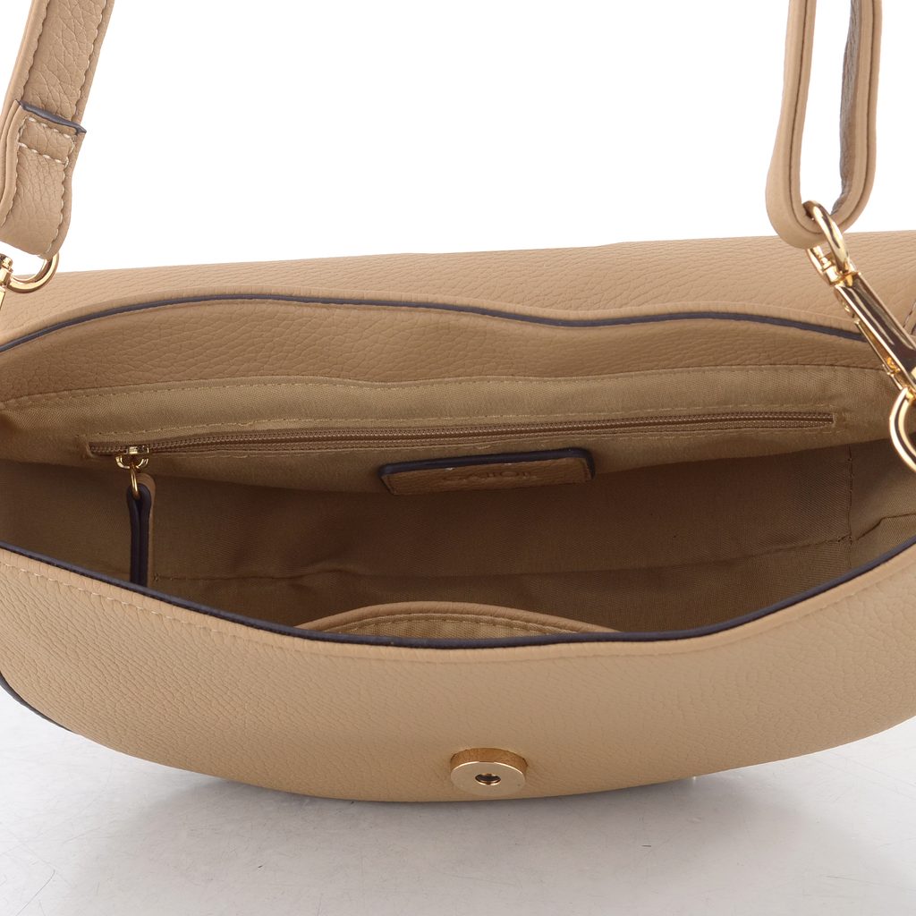 Menší dámská crossbody kabelka v béžové barvě se dvěma vyměnitelnými popruhy.