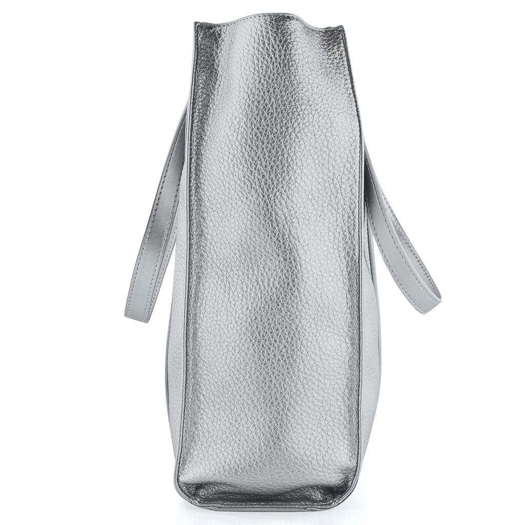 Prostorná dámská kabelka v jednoduchém střihu a módní metalické barvě.