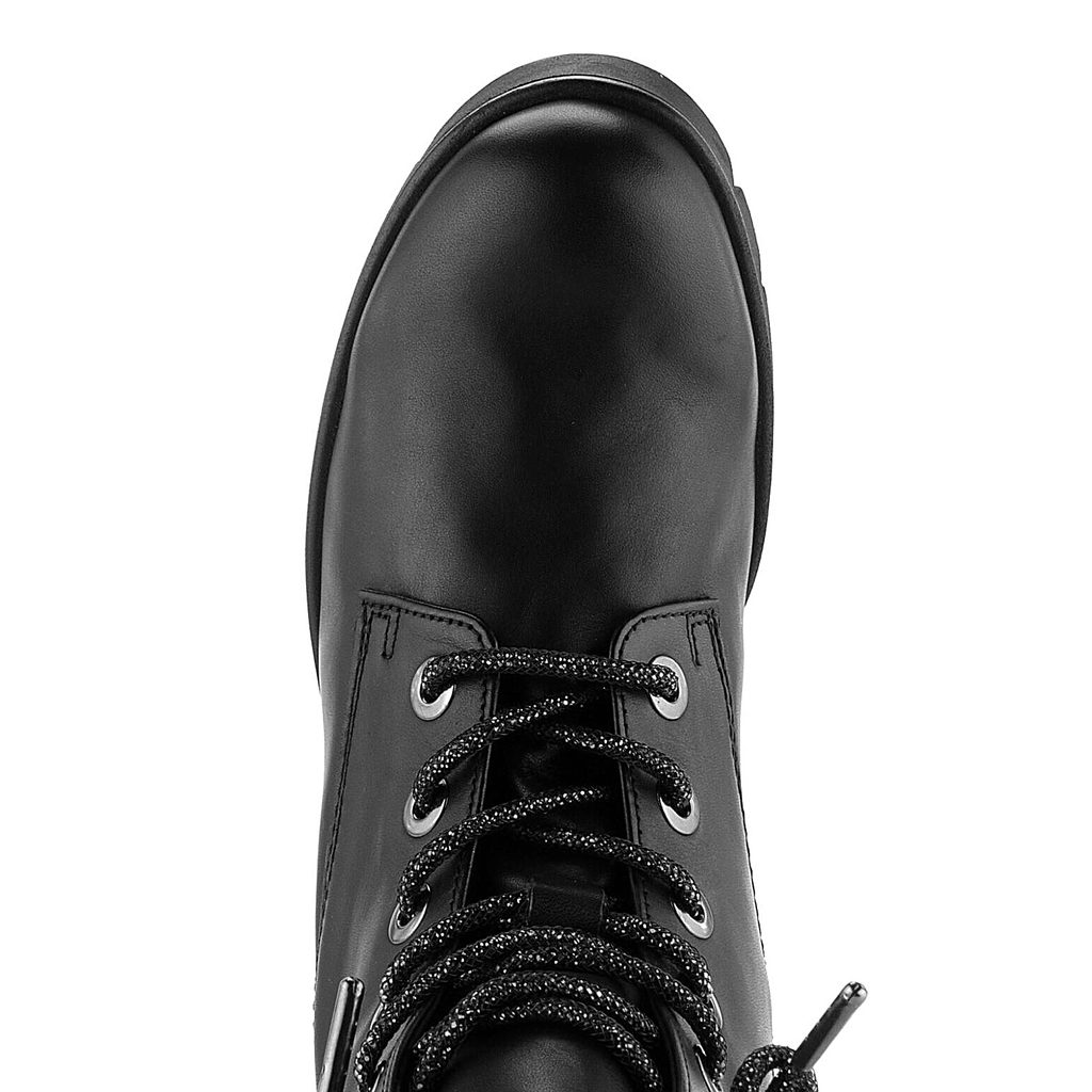 Dámský kotník z černé hladké kůže, s krásnými blyštivými tkaničkami, teplejší podšívkou a módní hrubou podešví.