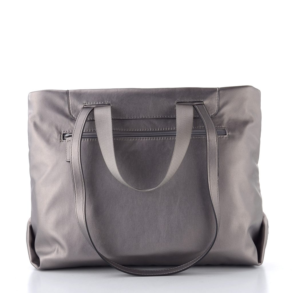 Dámská shopperka střední velikosti v metalickém provedení se vzorem na přední straně a madly do ruky i přes rameno.