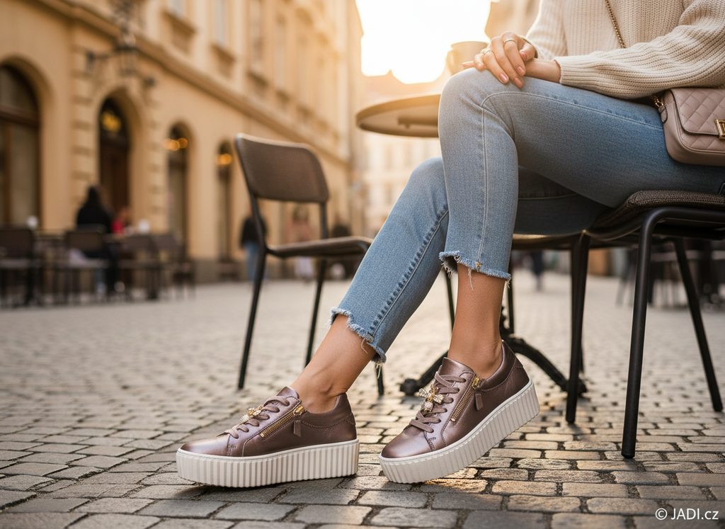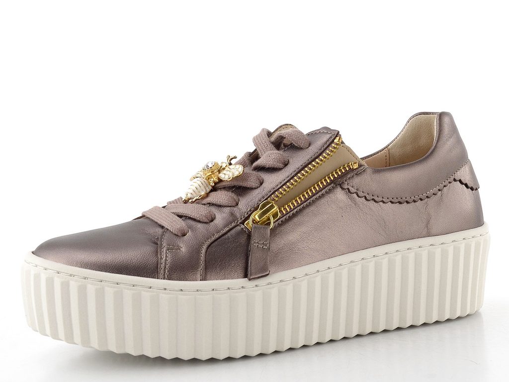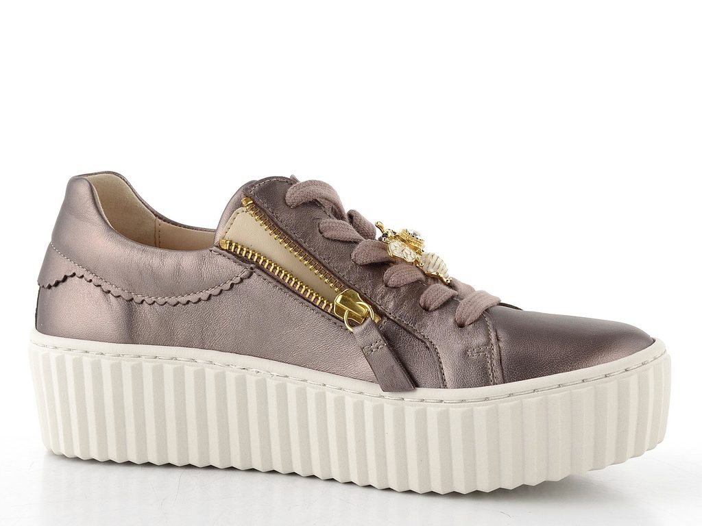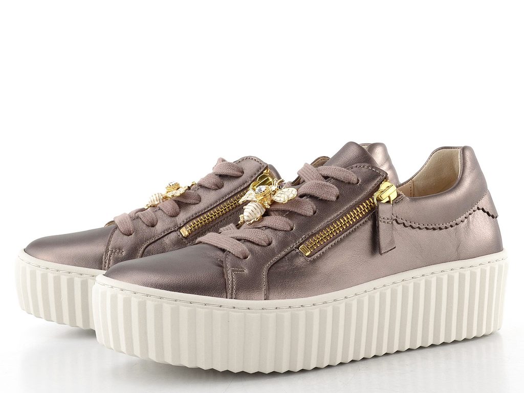 Dámské módní metalické tenisky na vysoké platformě s ozdobným čmeláčkem na tkaničkách od značky Gabor.