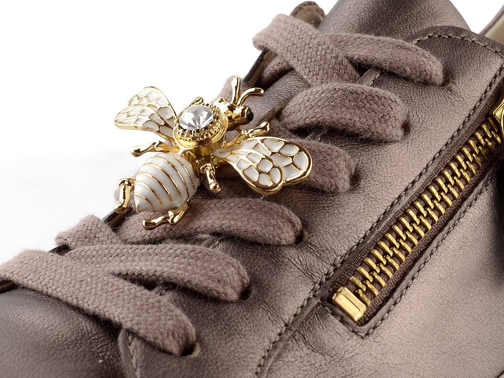 Dámské kožené tenisky/polobotky na platformě, se dvěma zipy a poutavou kovovou broží ve tvaru čmeláka.