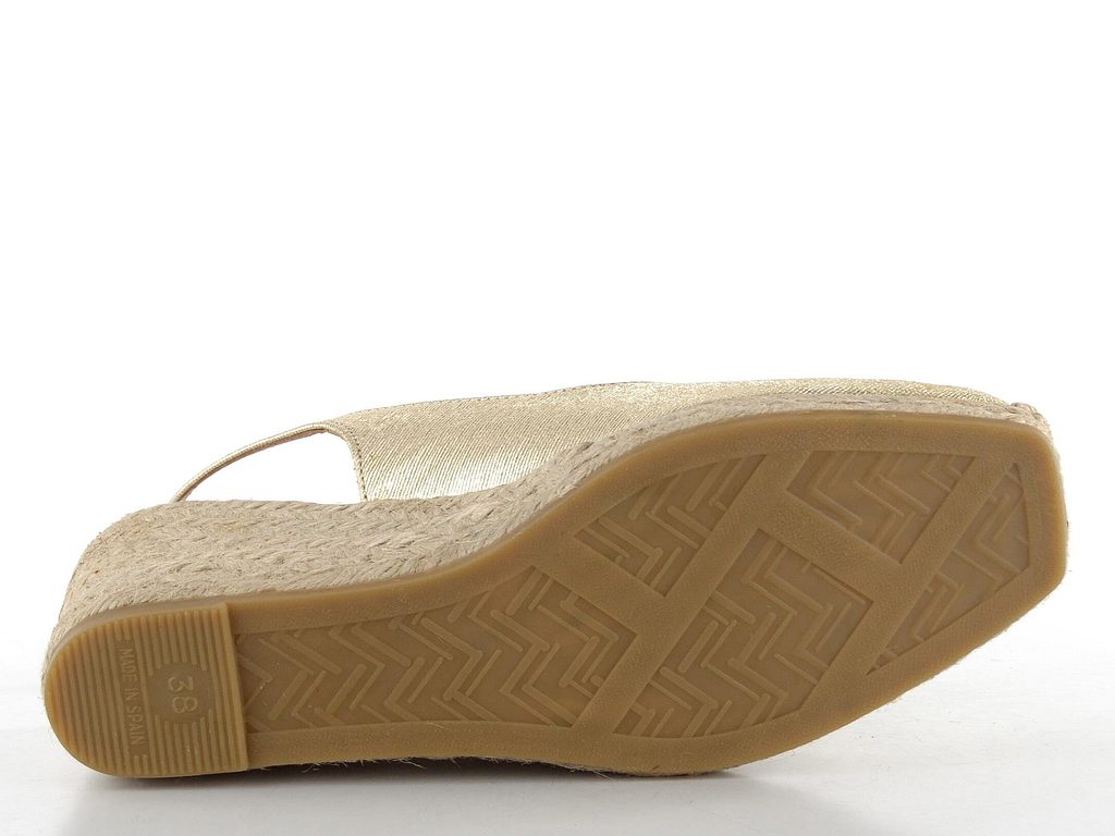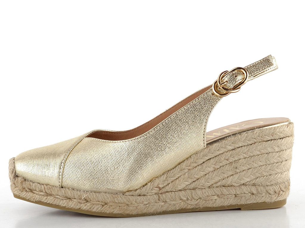 Jedinečné dámské lodičky v metalickém provedení s volnou patou a jutovým klínkem.