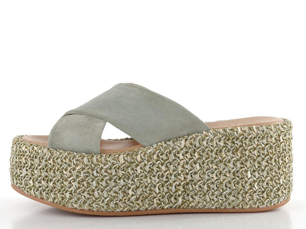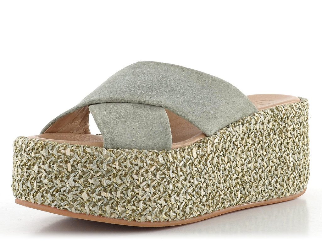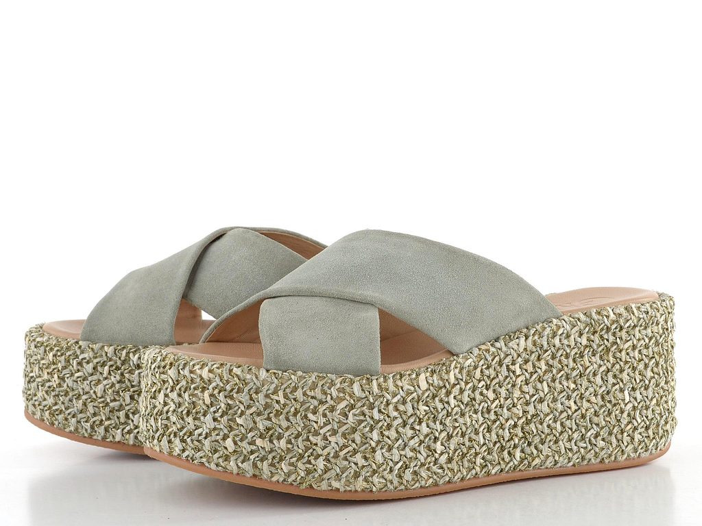 Dámské celokožené pantofle na extra vysoké platformě zdobené splétaným lýkem.