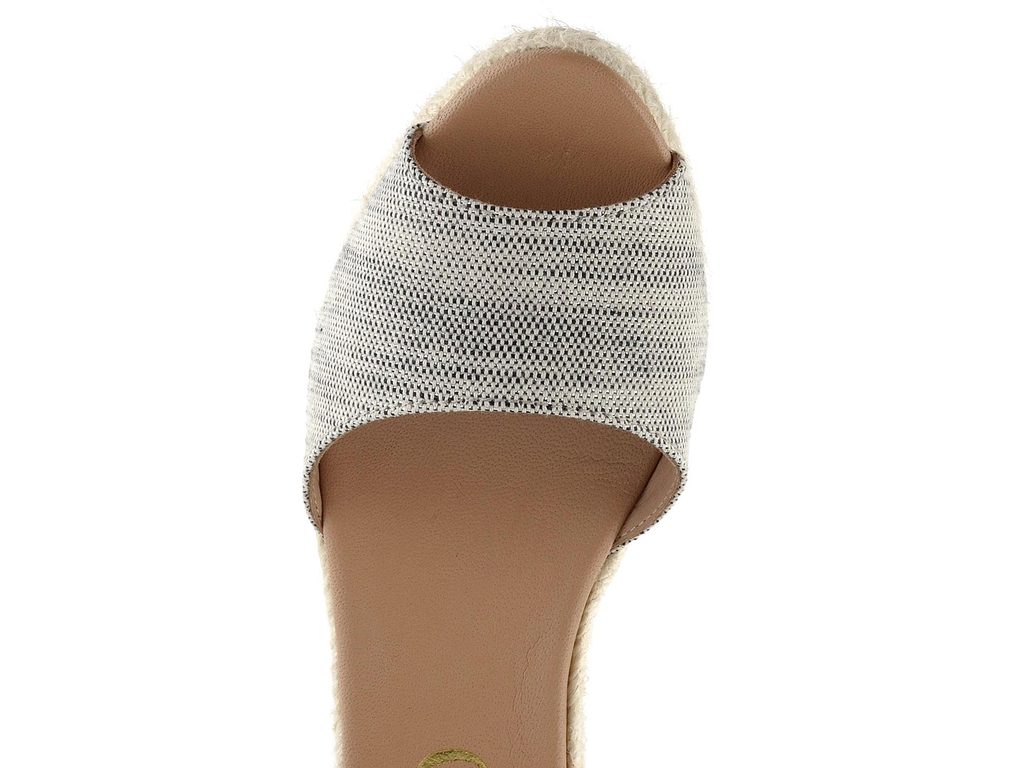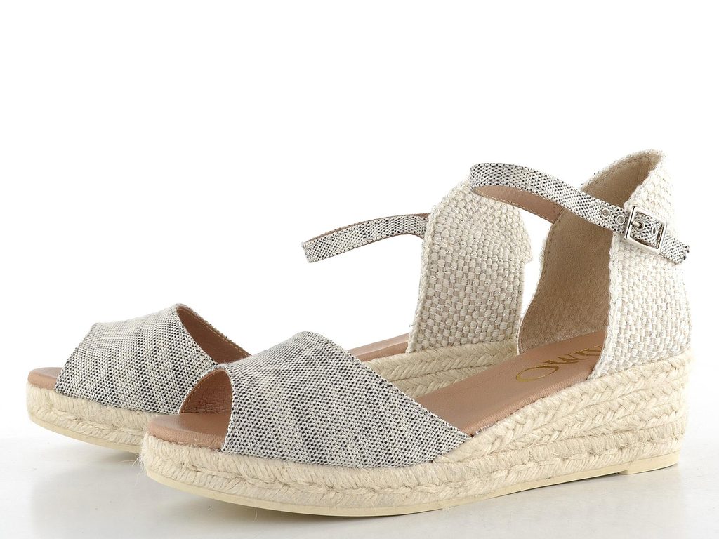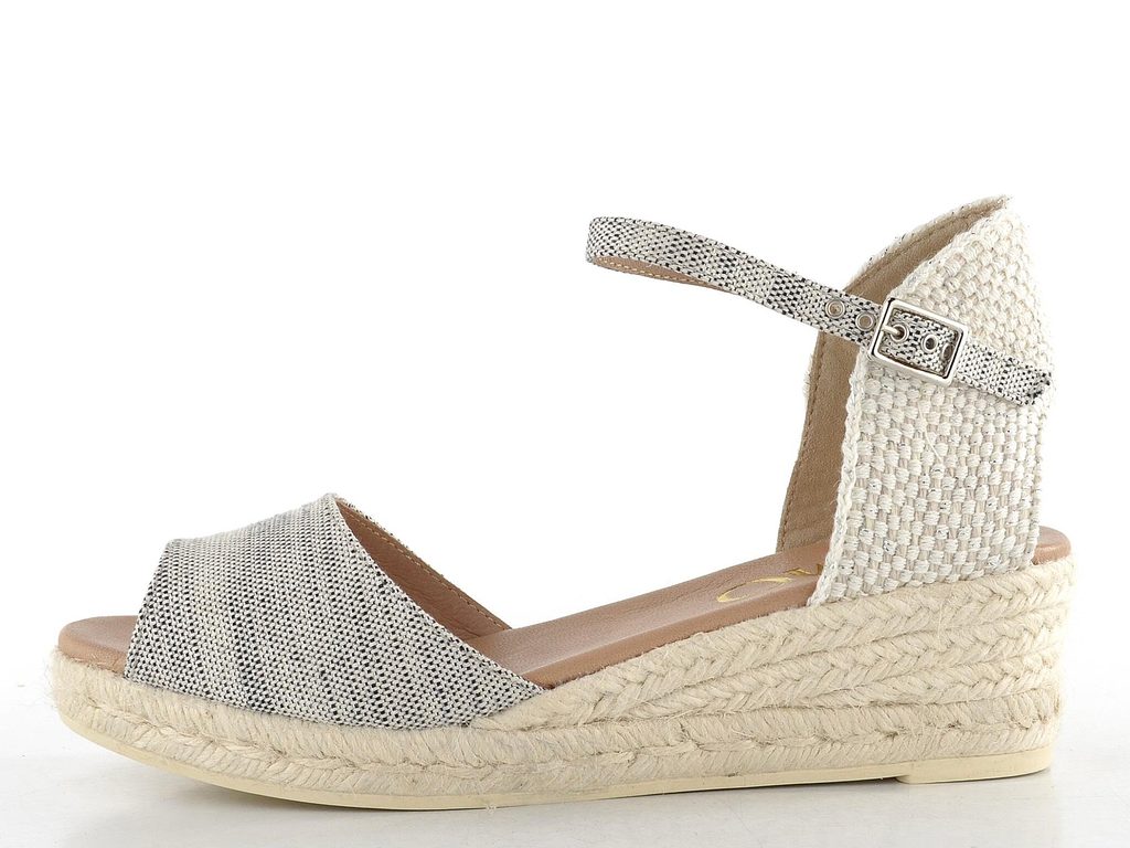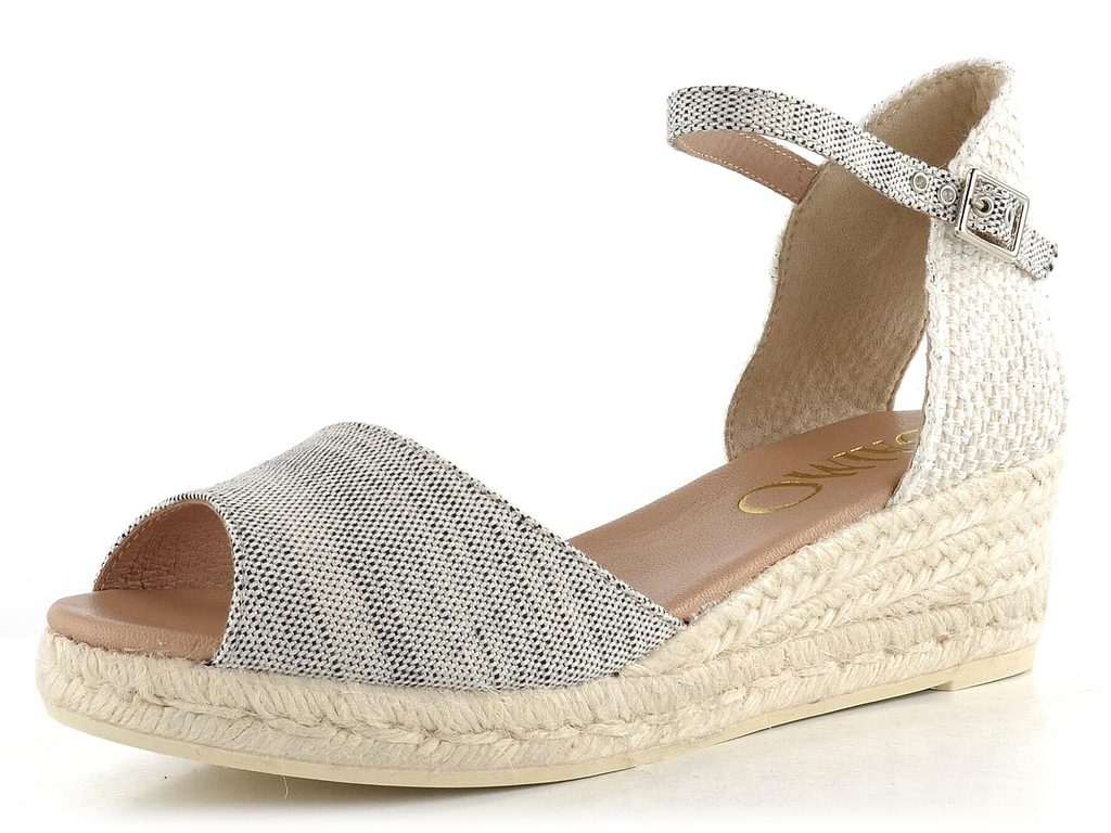 Slušivé dámské sandály z vytkávané textilie, s upínacím kotníkovým páskem a jutovým klínkem.