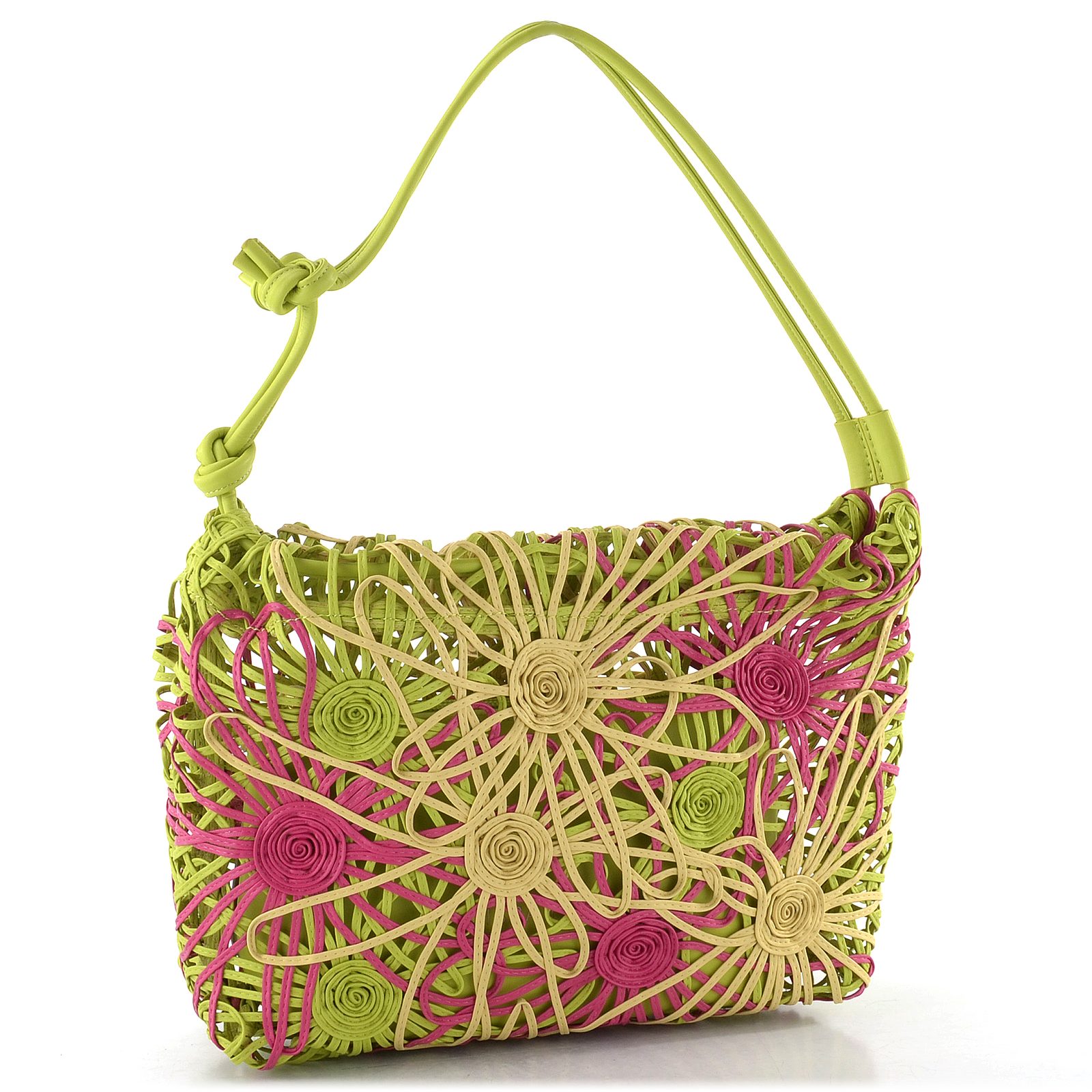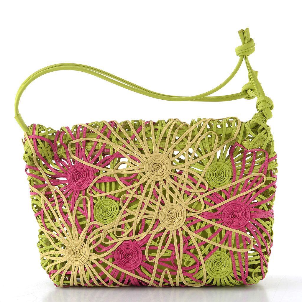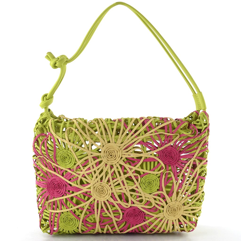 Originální dámská kabelka přes rameno z tenkých pásečků skládaných do květinového motivu a s vyjímatelnou vnitřní etují.
