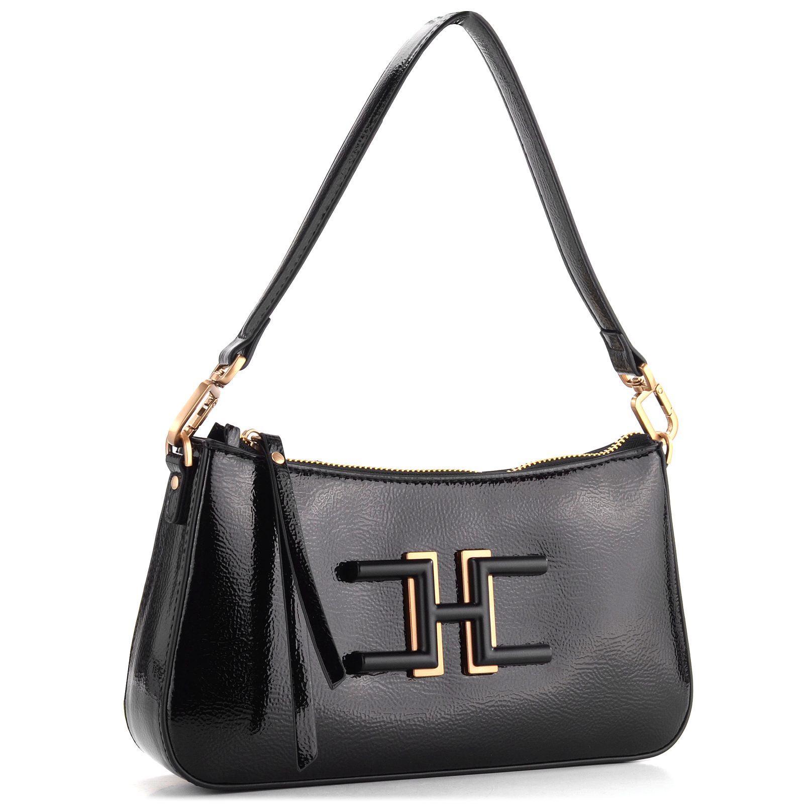 Elegantní dámská kabelka malé velikosti v lakovaném černém provedení, se dvěma odepínatelnými popruhy.