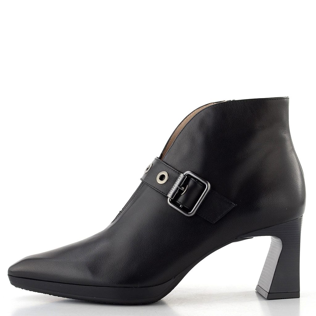 Elegantní špičatý kotník z hladké kůže v černé barvě, s postranním zipem a pruženkou přes nárt.