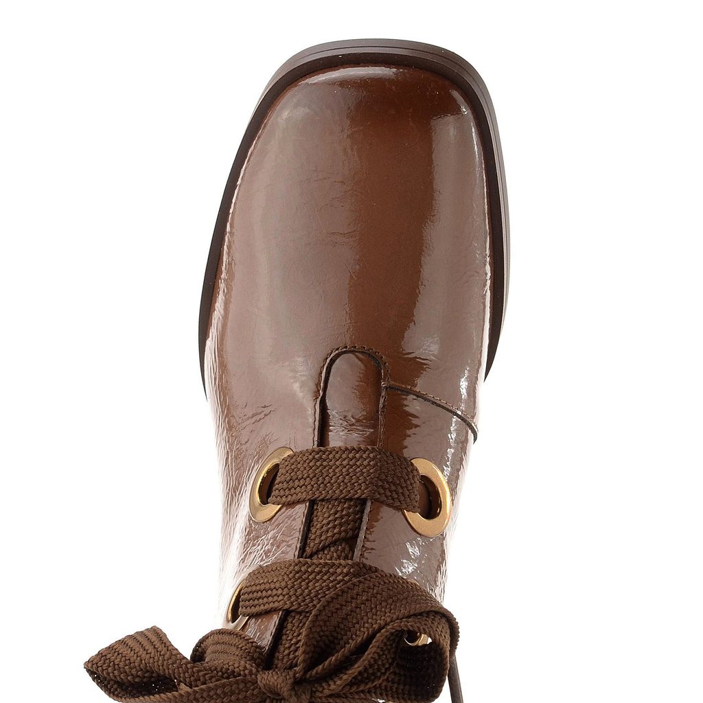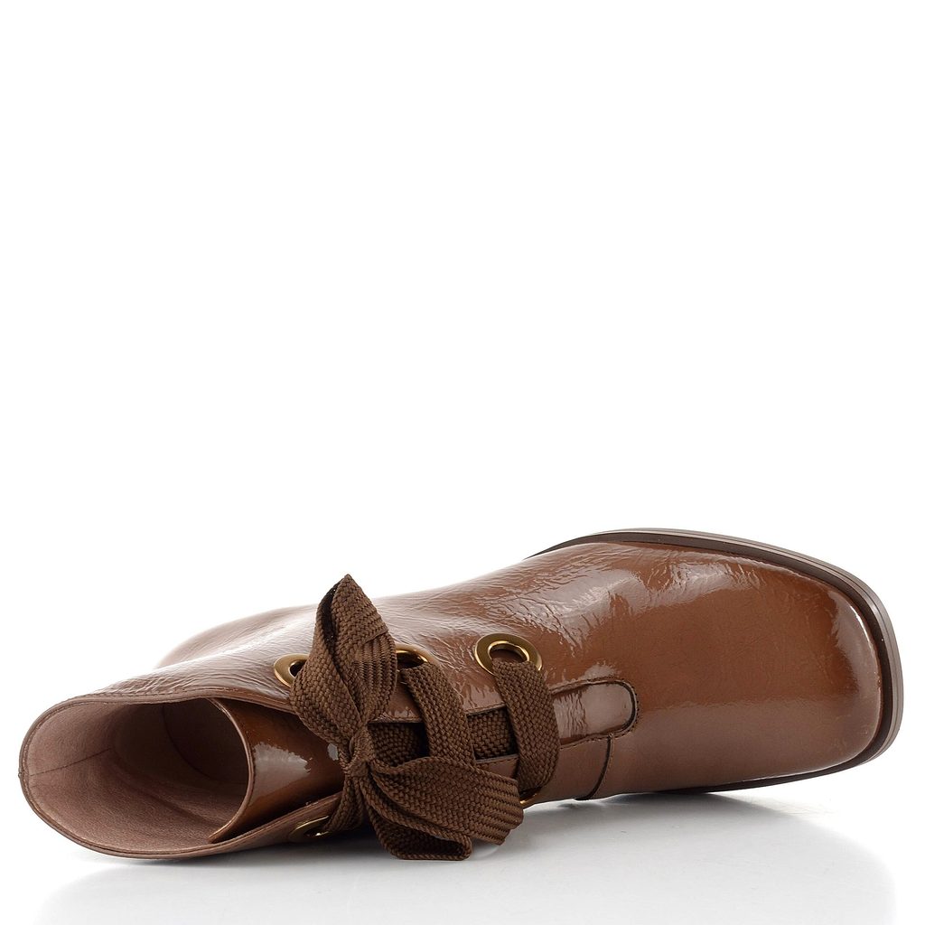 Elegantní hnědý kotník na podpatku, se svrškem z lakované kůže doplněné nápadným provazováním.