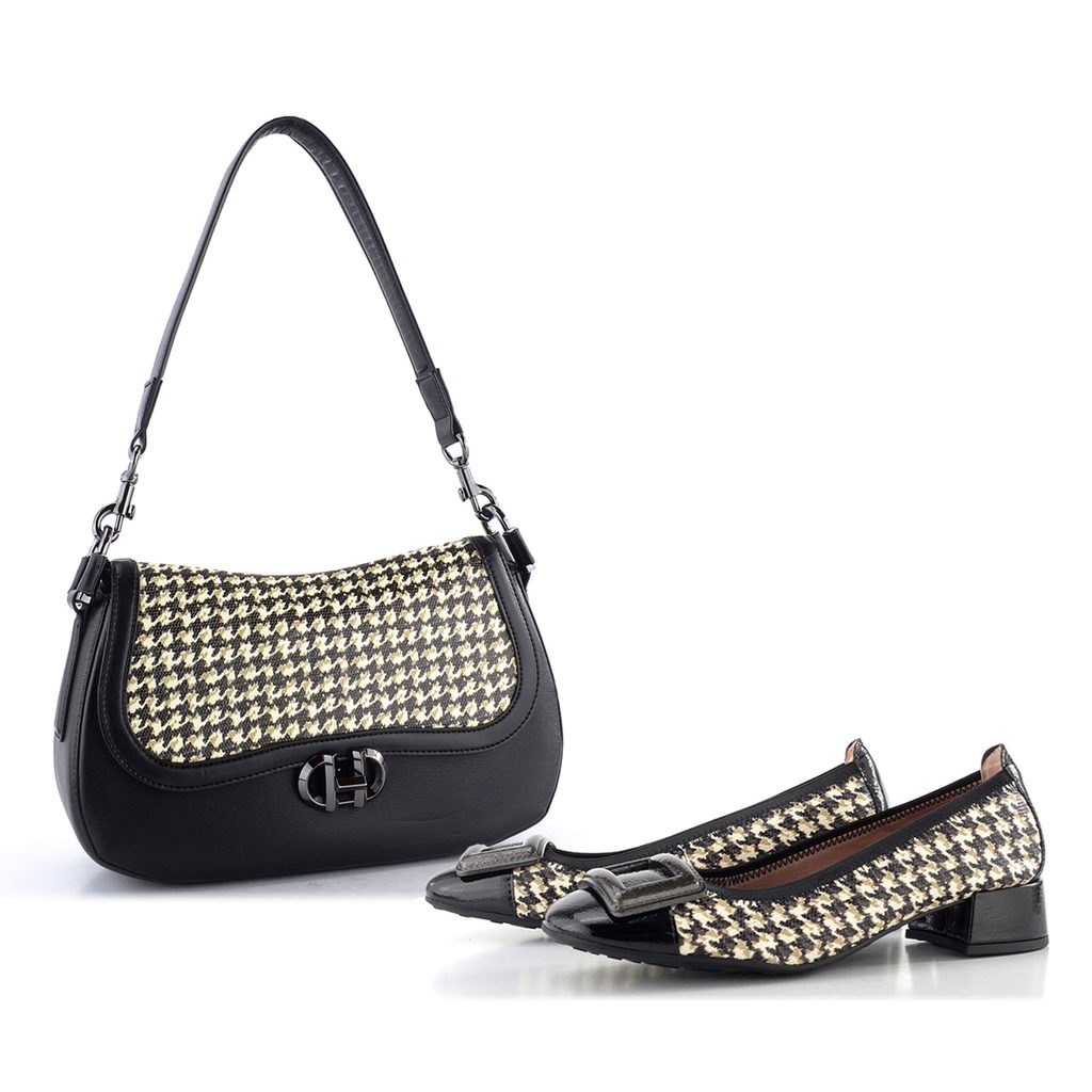 Dámské lodičky z kombinace vzorované a lakované kůže, doplněné velkou sponou na špičce.