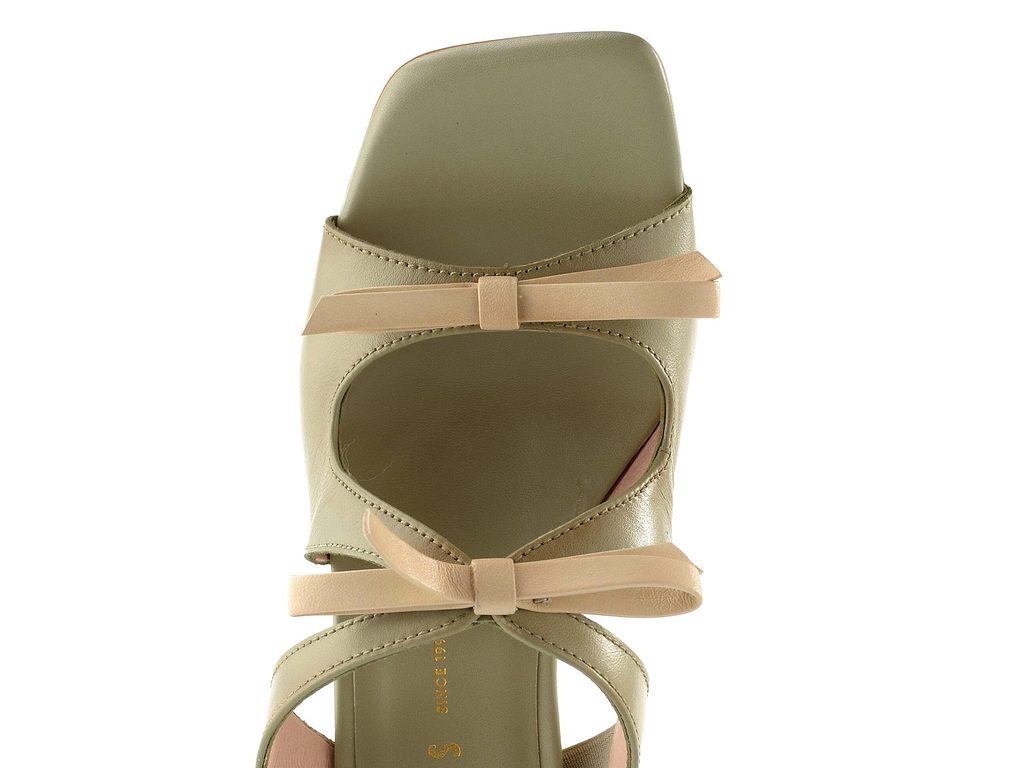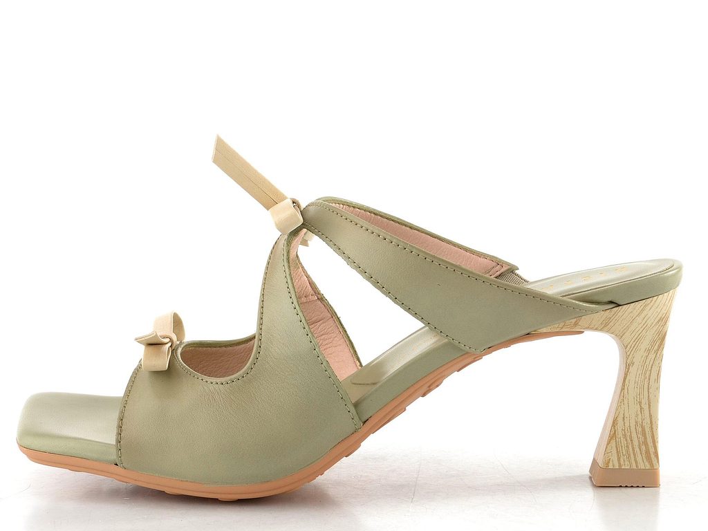 Výjimečné dámské kožené pantofle v zelené barvě s mašličkami a štíhlým tvarovaným podpatkem.