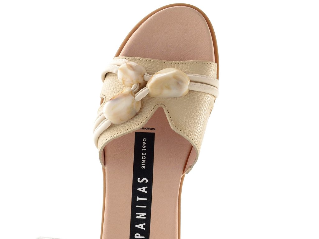 Výjimečné dámské kožené pantofle v béžové barvě, zdobené bižuterními kameny.