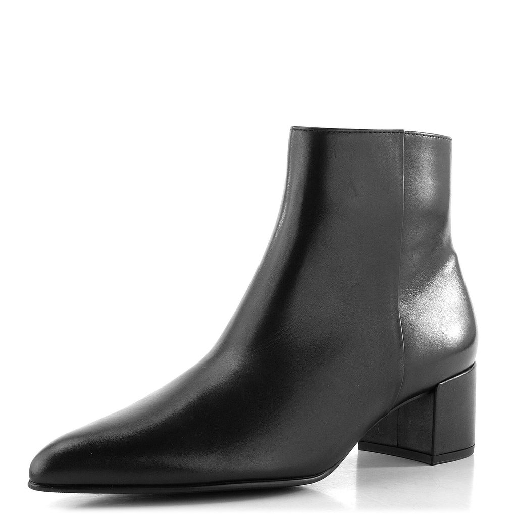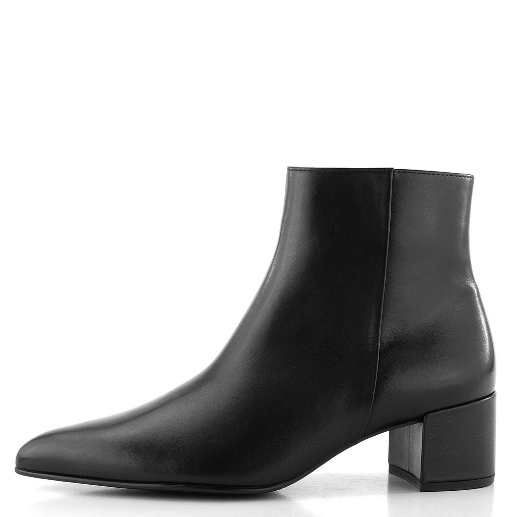 Dámský stylový kotník z černé hladké kůže, s elegantní úzkou špičkou a pohodlným stabilním podpatkem.