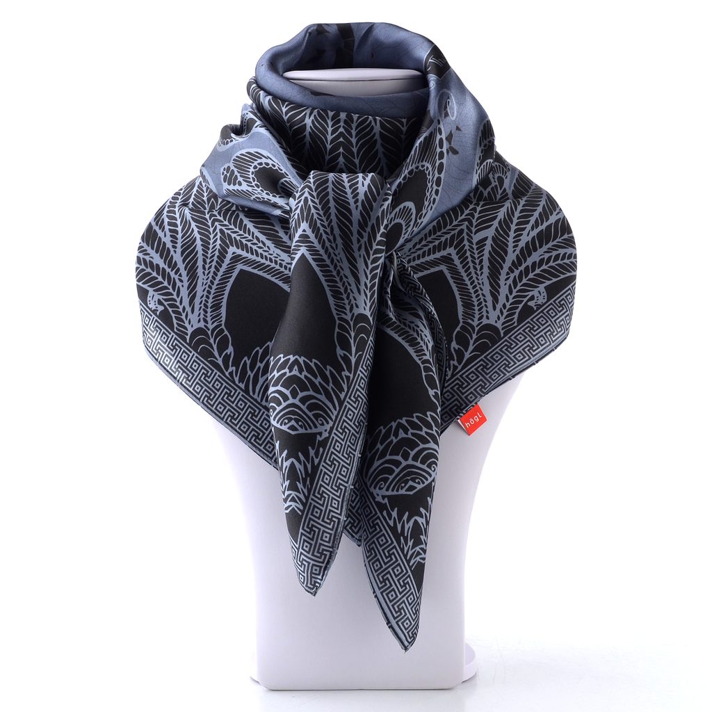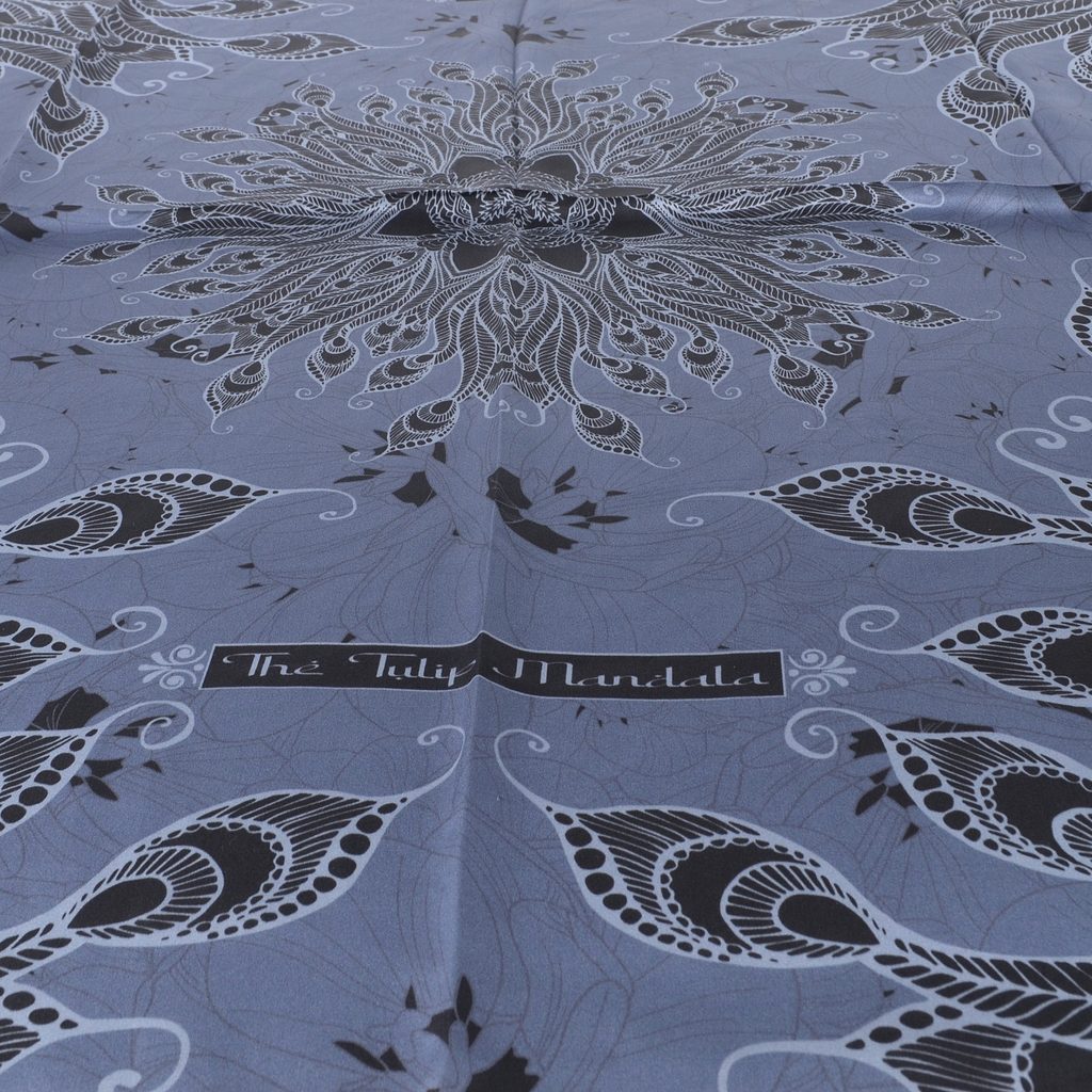 Luxusní hedvábný šátek s mandalou v šedo-černé kombinaci barev.